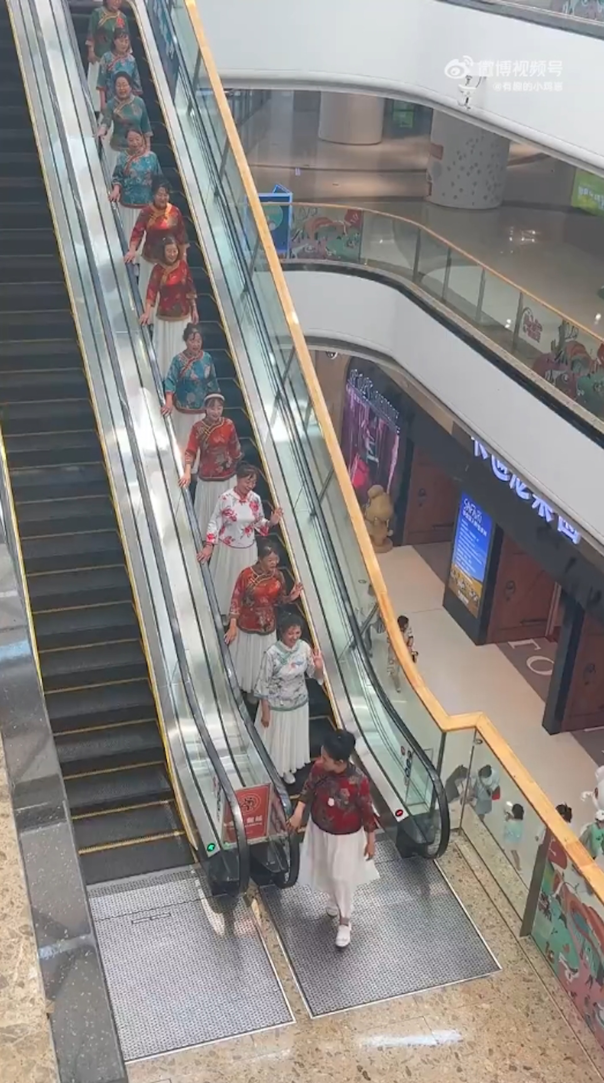 有目擊民眾表示,這些大媽穿著風格統一的傳統服飾,站在手扶梯一側,整齊的下樓並對著鏡頭打招呼,到達下一層樓後,她們又重新折返向上,這時有2名來逛商場的路人也想搭電扶梯,卻被大媽伸手阻攔。影片被放上網後,不少網友留言痛批這樣自私的行為「流水線上的豬」「社會公害」「可以拍攝,但不能影響其他人的使用權利」,該商場也出面回應,如果下次工作人員有看到會上前阻止,也會將此事匯報給上級。 |