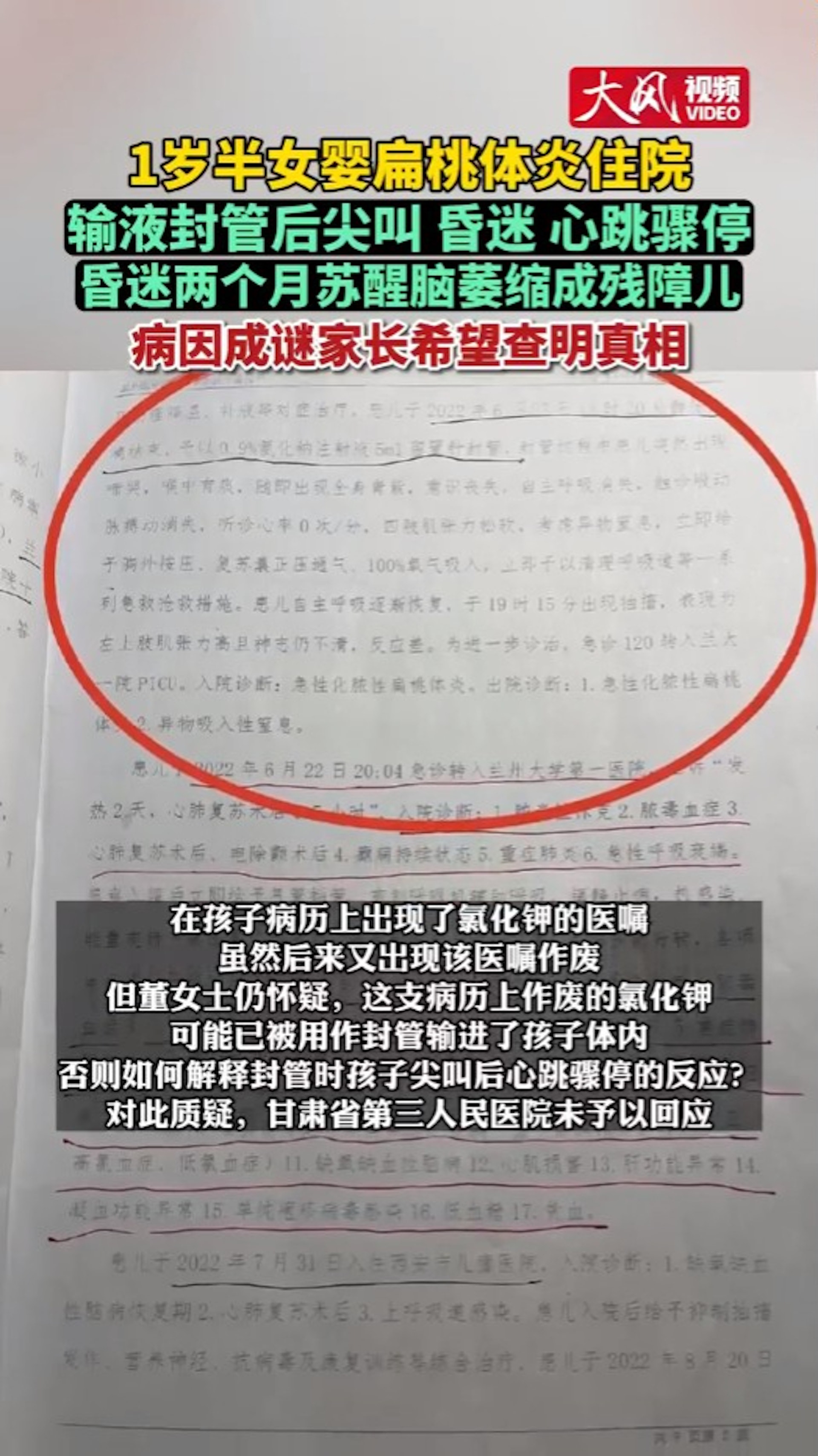 據甘肅省第三人民醫院的病歷顯示,封管過程中患兒突然出現啼哭,喉中有痰,隨即出現全身青紫,意識喪失,自主呼吸消失,觸診股動脈搏動消失,聽診心率0次/分,四肢肌張力鬆軟,考慮異物窒息。該院給予一系列搶救措施後,患者神智仍不清。為進一步診治,轉入蘭大一院PICU(兒童深切治療部)。在該院的出院診斷上,寫着「急性化膿性扁桃體炎」,以及「異物吸入性窒息」。