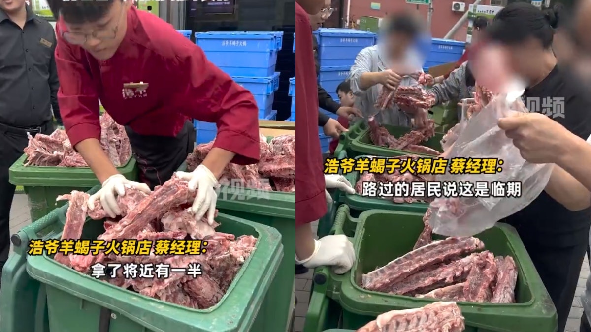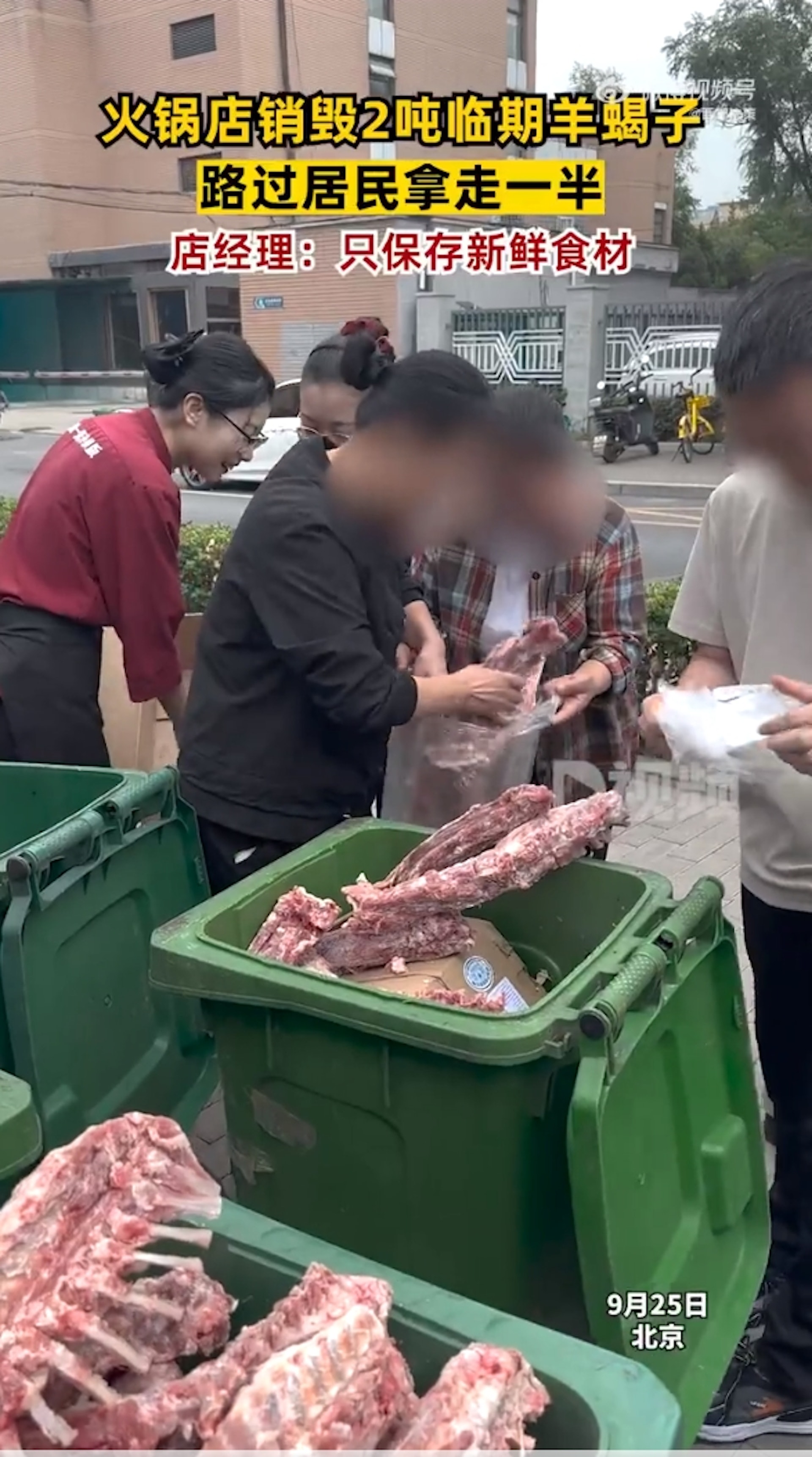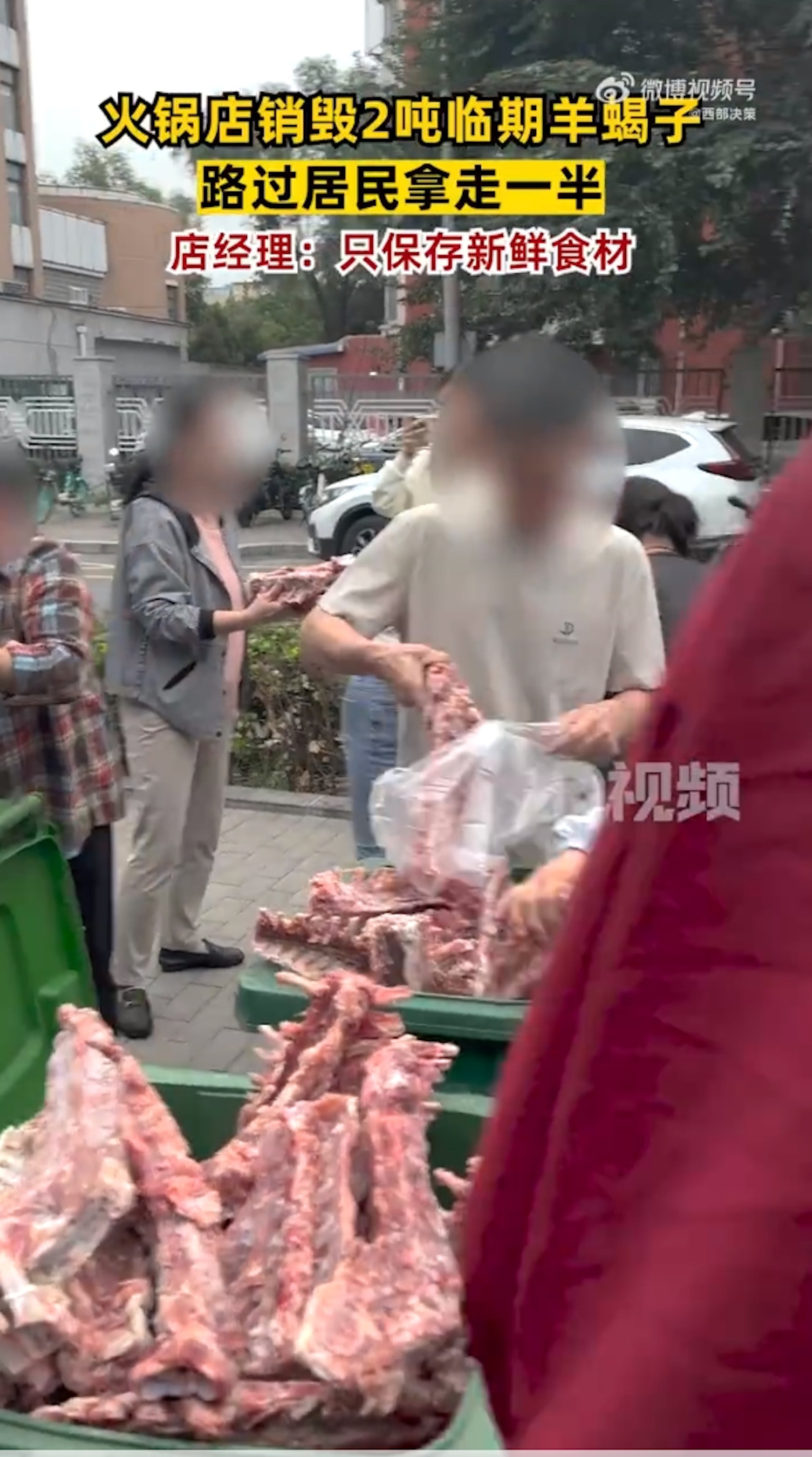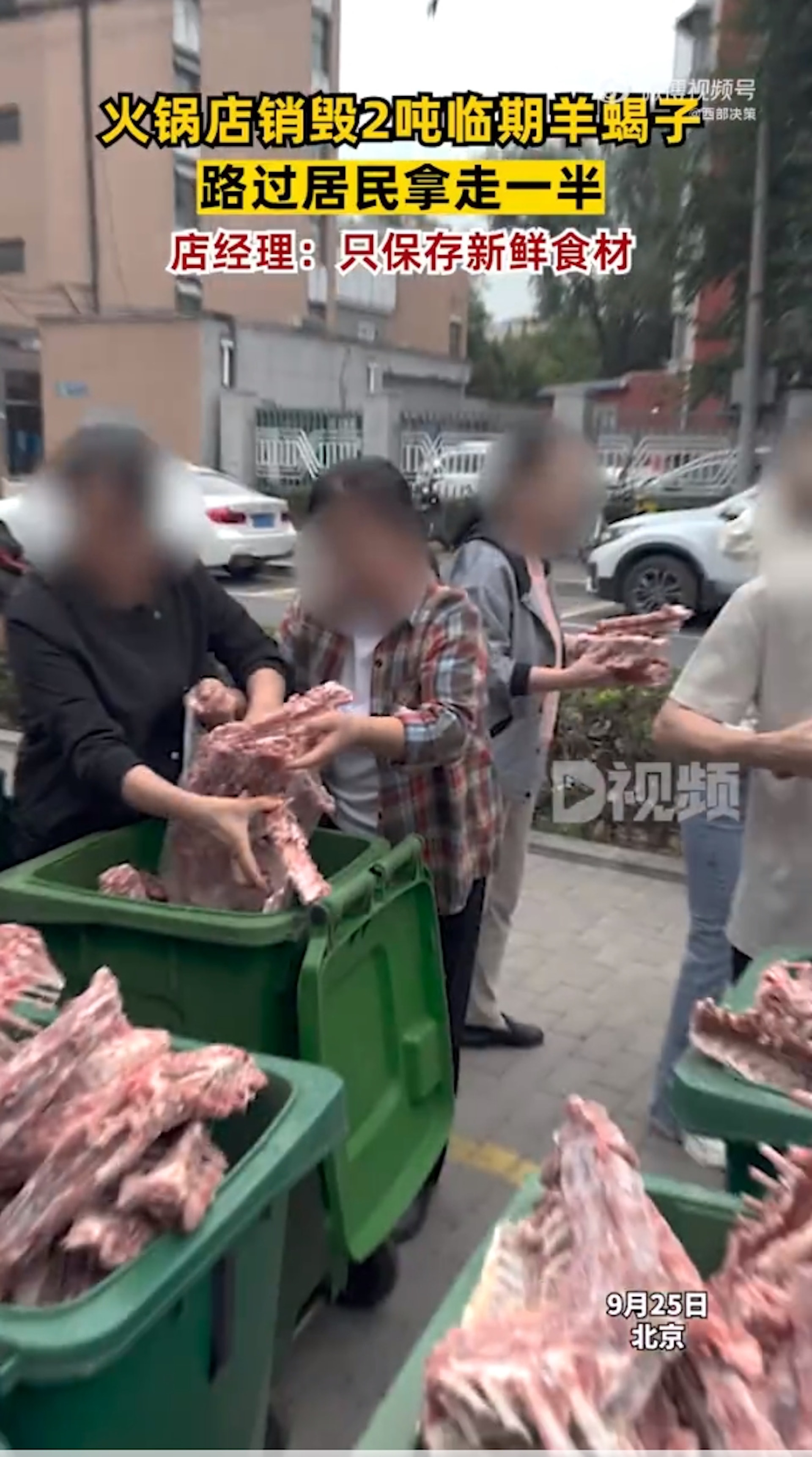 北京一家火鍋店25日在店門口丟棄即期羊蠍子,剛好被民眾路過看見,頓時一群人蜂擁狂撈垃圾桶,2噸貨不一會時間只剩一半,引起熱議。(微博影片截圖)