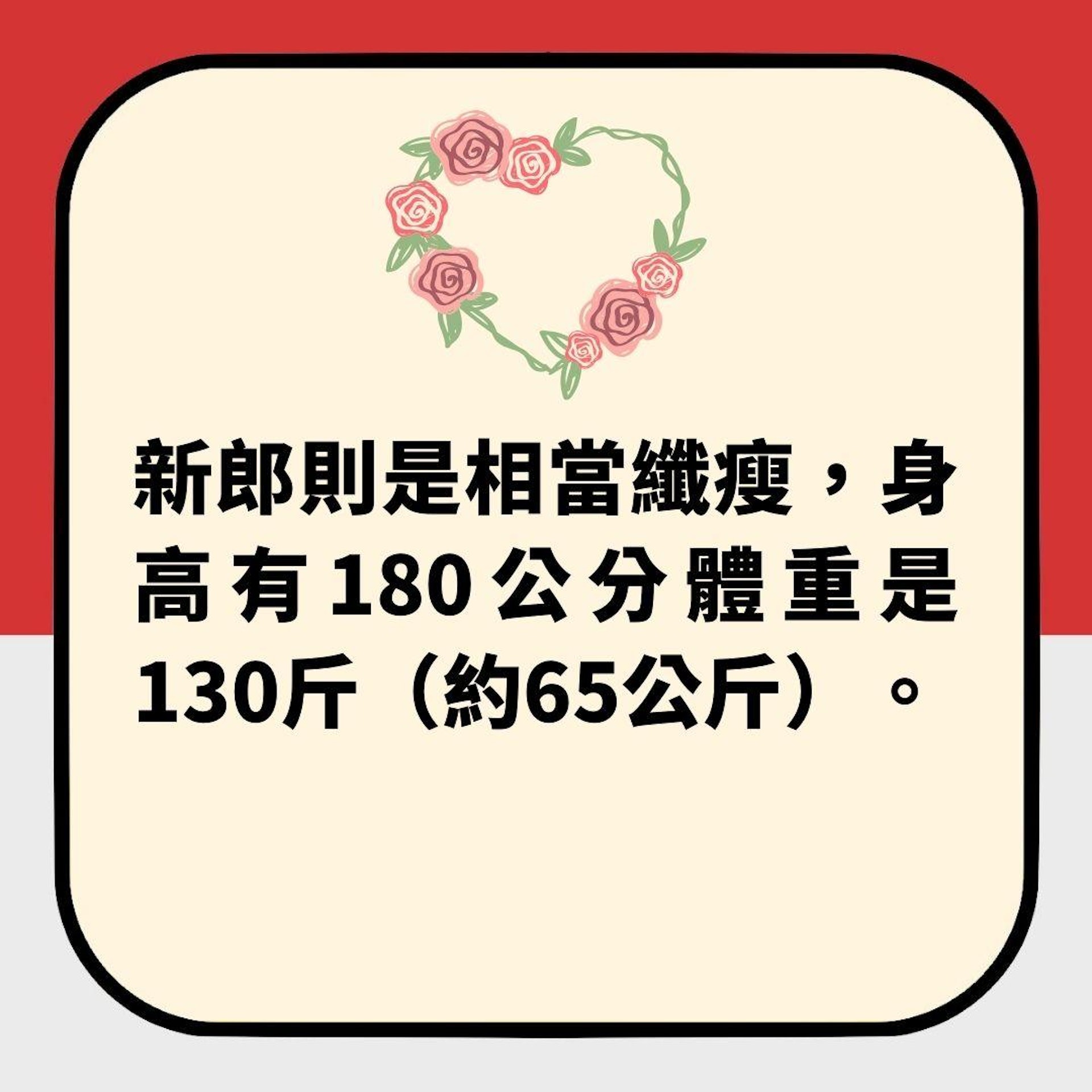 知情人士透露,新娘今年已經43歲,身形較豐腴,有230斤(約115公斤),新郎則是相當纖瘦,身高有180公分體重是130斤(約65公斤)。