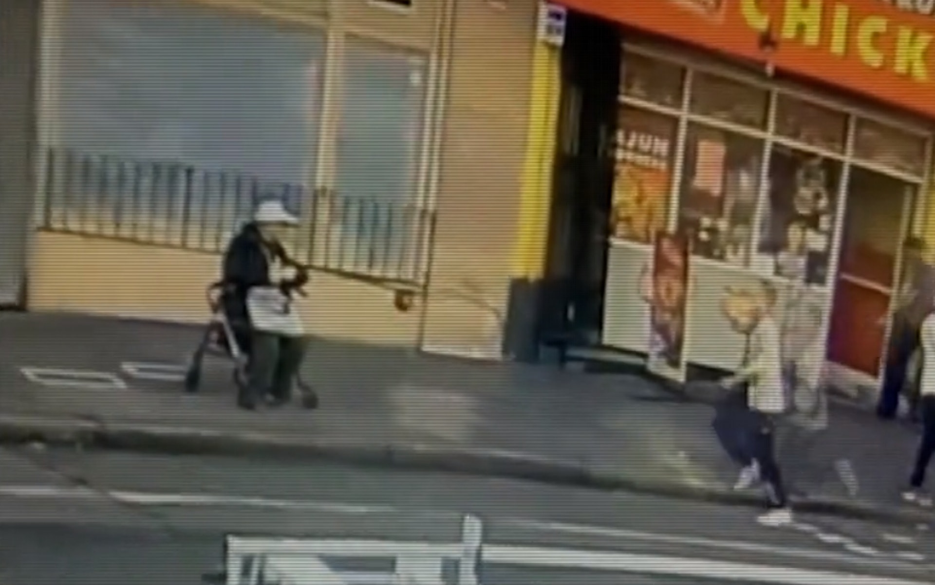 在2020年2月20日上午,當時廖榮炘在三藩市街頭獨自坐在輪椅上,正在等車回公寓。當時一名年輕男子從馬路對面跑過來,突然凌空一腳踢倒廖榮炘,廖榮炘的後腦重重撞在地上,血流如注昏迷過去。(影片截圖)