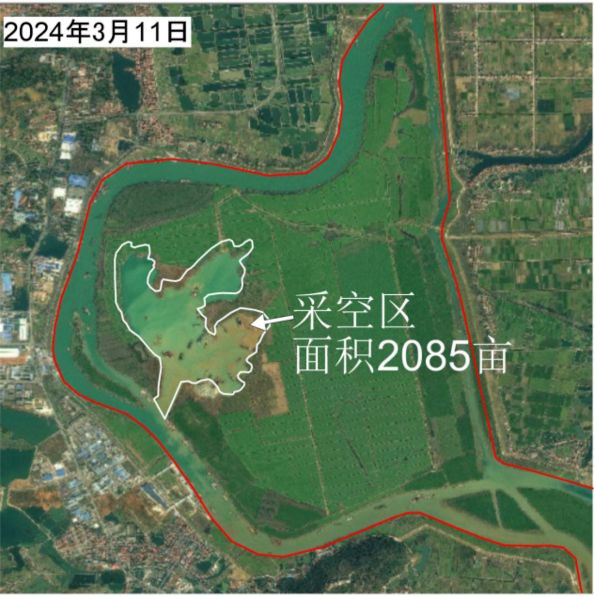 : k5 g4 B! V& B% o督察組查詢衛星影像顯示,澧水河口濕地保護區孟姜垸洲灘被大面積採挖。(新華社/督察組供圖)