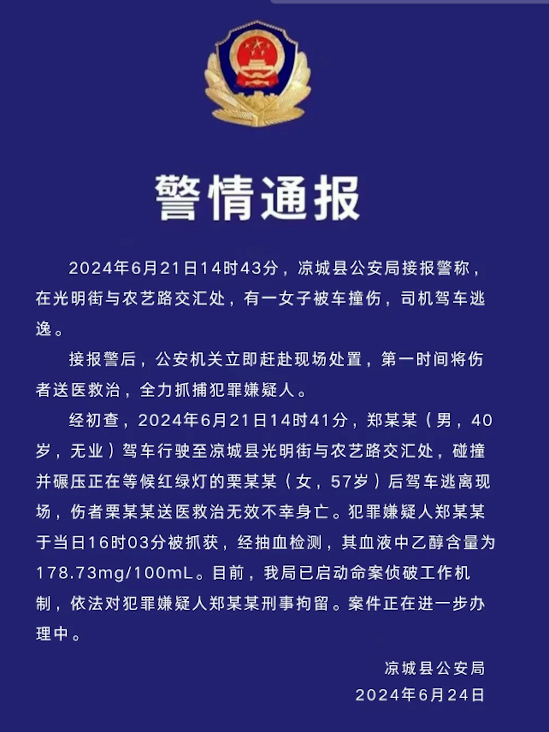 6月24日,凉城縣公安局發布通報稱,經查,6月21日下午2時41分,40歲男司機鄭某某駕車行駛至涼城縣光明街與農藝路交匯處,碰撞並碾壓正在等候紅綠燈的57歲女子票某某,鄭某某之後駕車逃離現場,栗某某送院搶救後不治。