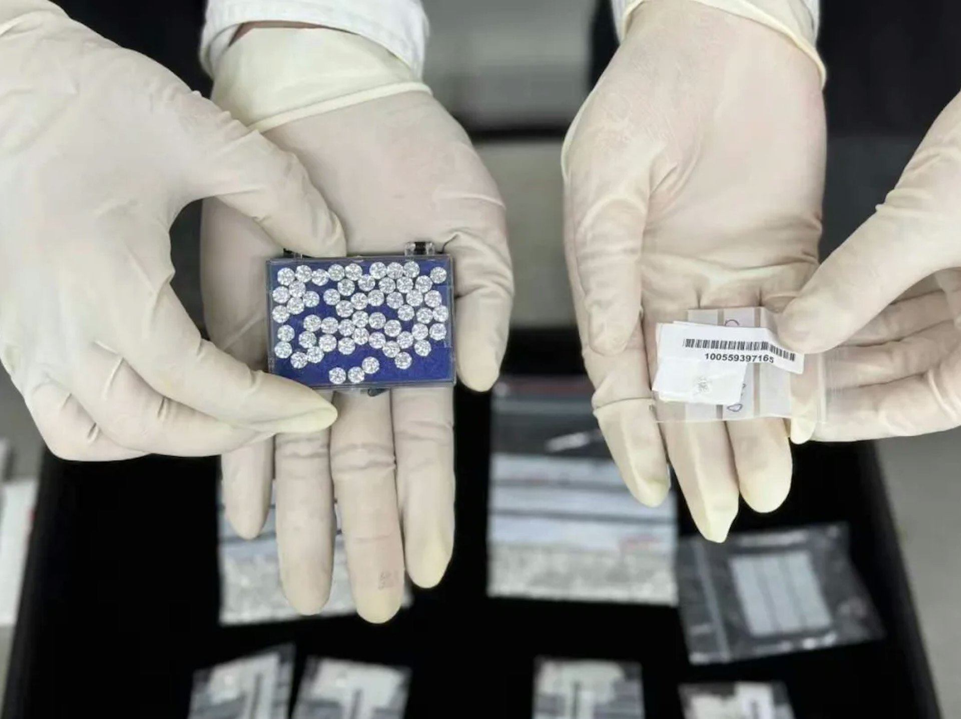 經進一步檢查,發現該旅客腰腹部綁有黑色膠袋一個,袋中藏匿鑽石57粒、碎鉆一包,合共171卡。經鑒定,案值約21萬元人民幣。