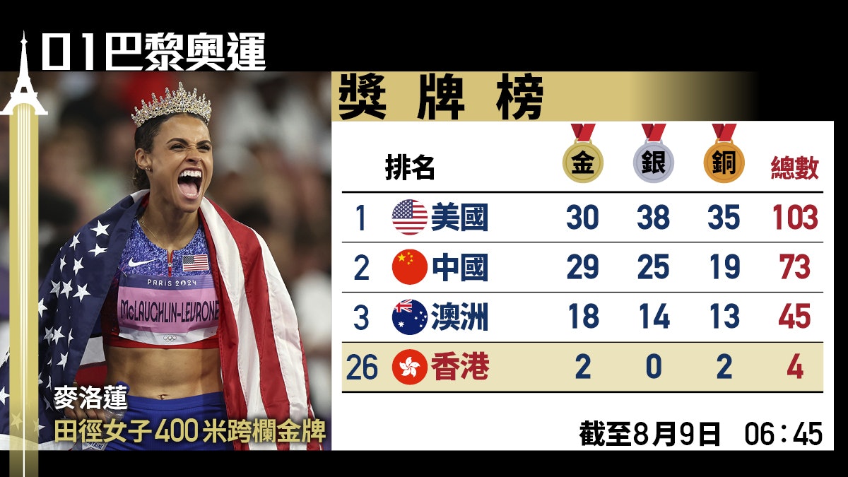 巴黎奧運獎牌榜|美國30金力壓29金中國 澳洲18金第三 香港排26