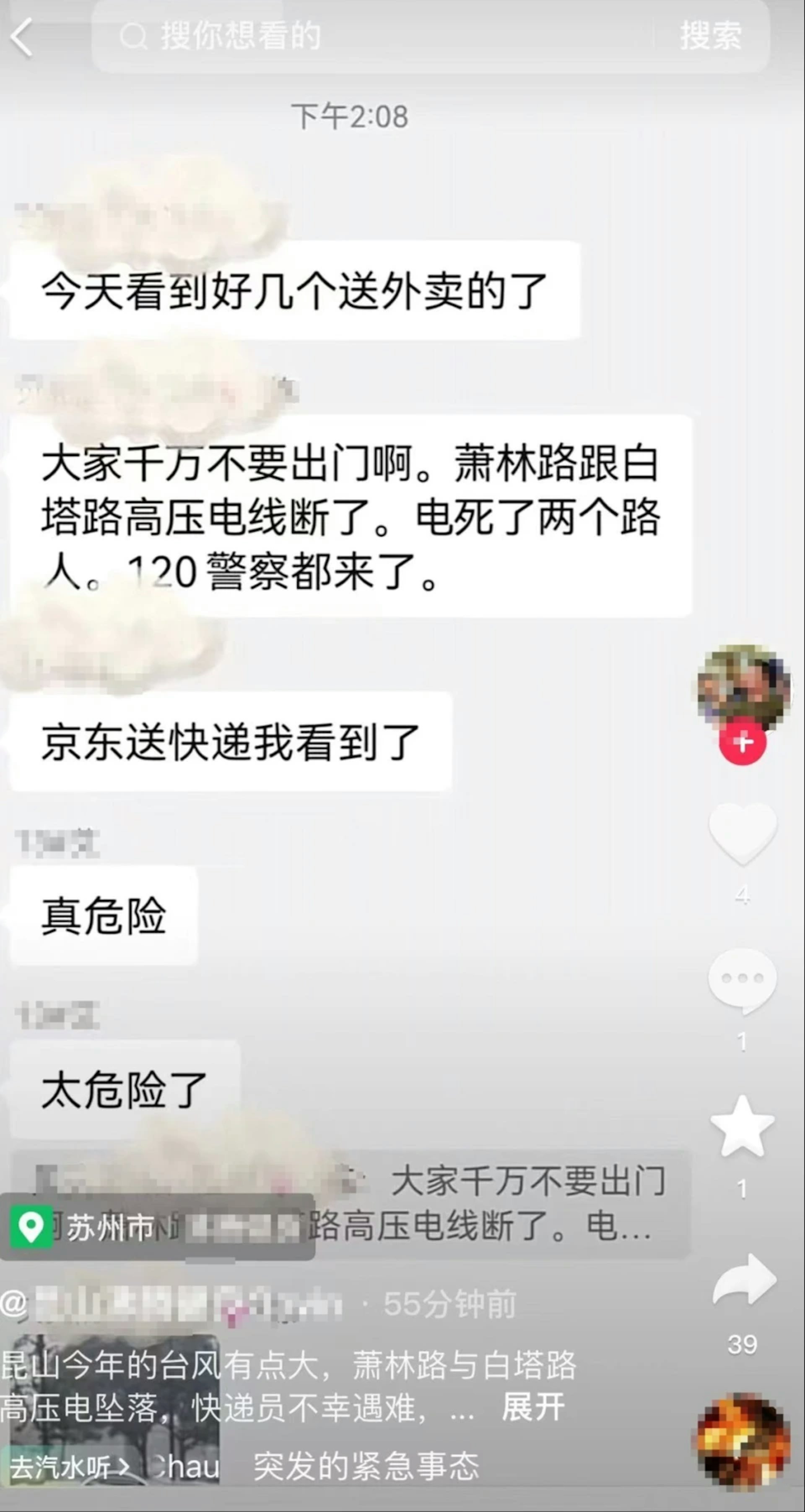 內媒《瀟湘晨報》今(16日)報道,有網友發佈影片並稱,「颱風來襲,高壓電線墜落,崑山蕭林路跟白塔路兩名快遞員不幸被電」。影片中顯示,有消防、救護車在現場處理。另有影片顯示,該路上有墜落的樹枝等雜物。tvb now,tvbnow,bttvb: A" w- F. t$ R1 |' ~
