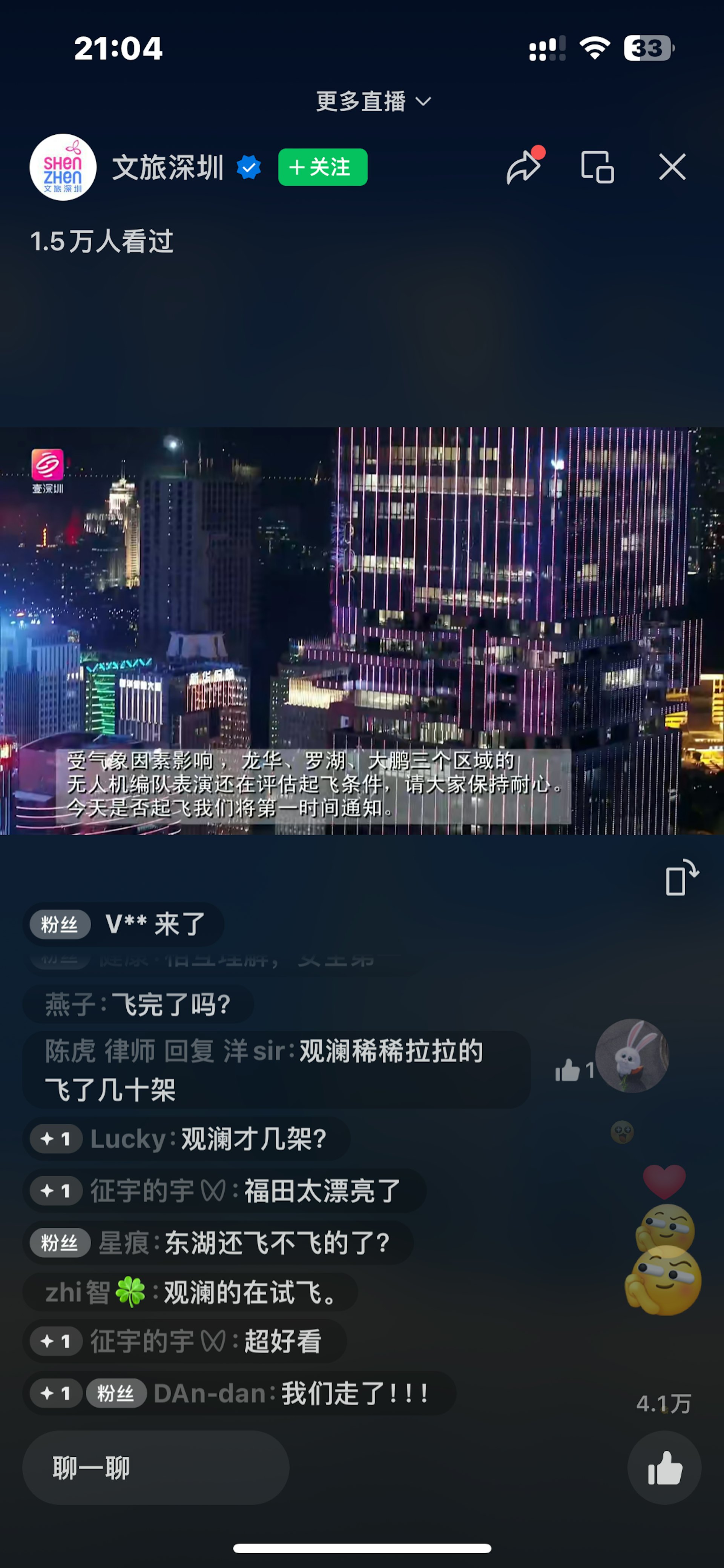, o$ x% w0 [, N, n1 v s l- Z1 P「文旅深圳」今晚(1日)九點直播指出,目前受氣象影響,龍華、羅湖、大鵬三個區域的無人機編隊表演尚在評估起飛條件。(直播截圖)