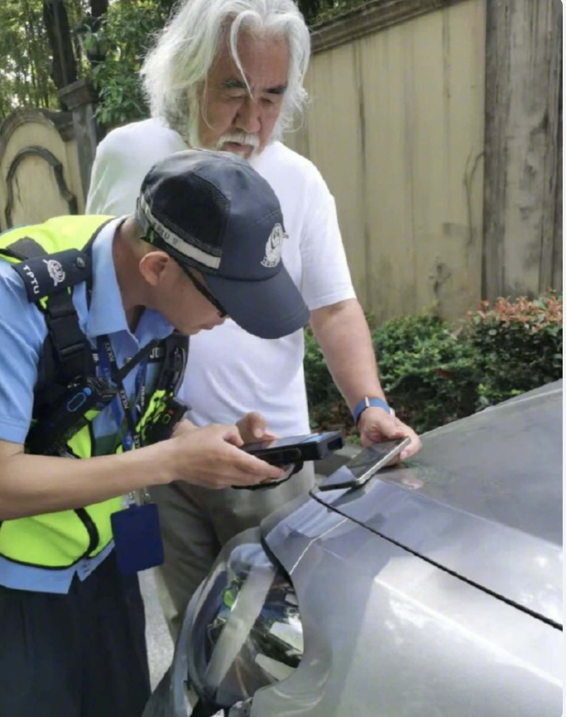 照片中,張紀中滿頭白髮,穿著白色T恤和卡其色褲子,等待交警的,他坐在路旁花壇邊,凝視著不遠處的兩台事故車,有點鬱悶。: S( m) p( d: M* Z6 C, m