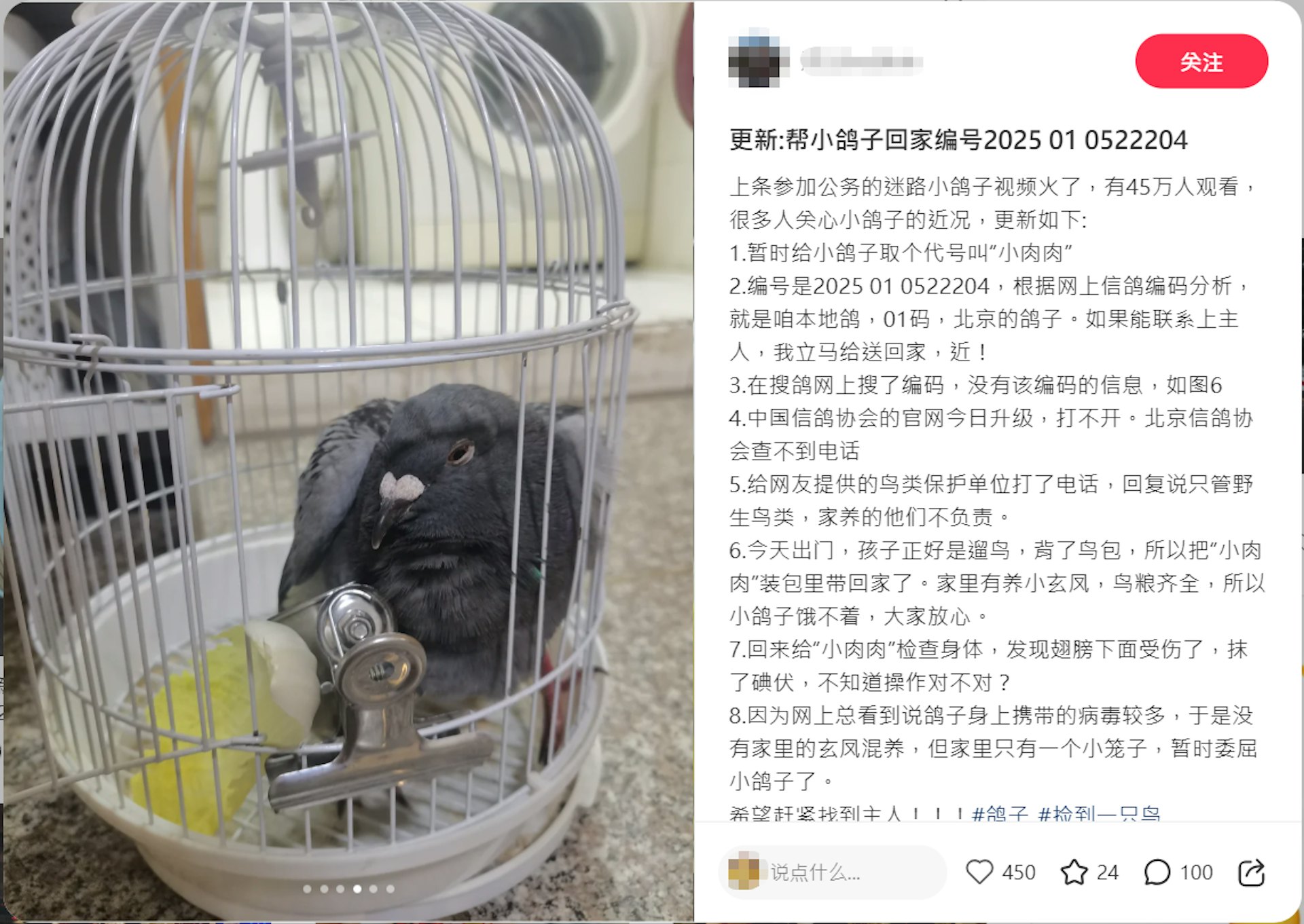 7 p( g' F# s+ P/ z. C有網民偶遇疑似迷路的信鴿。(小紅書)