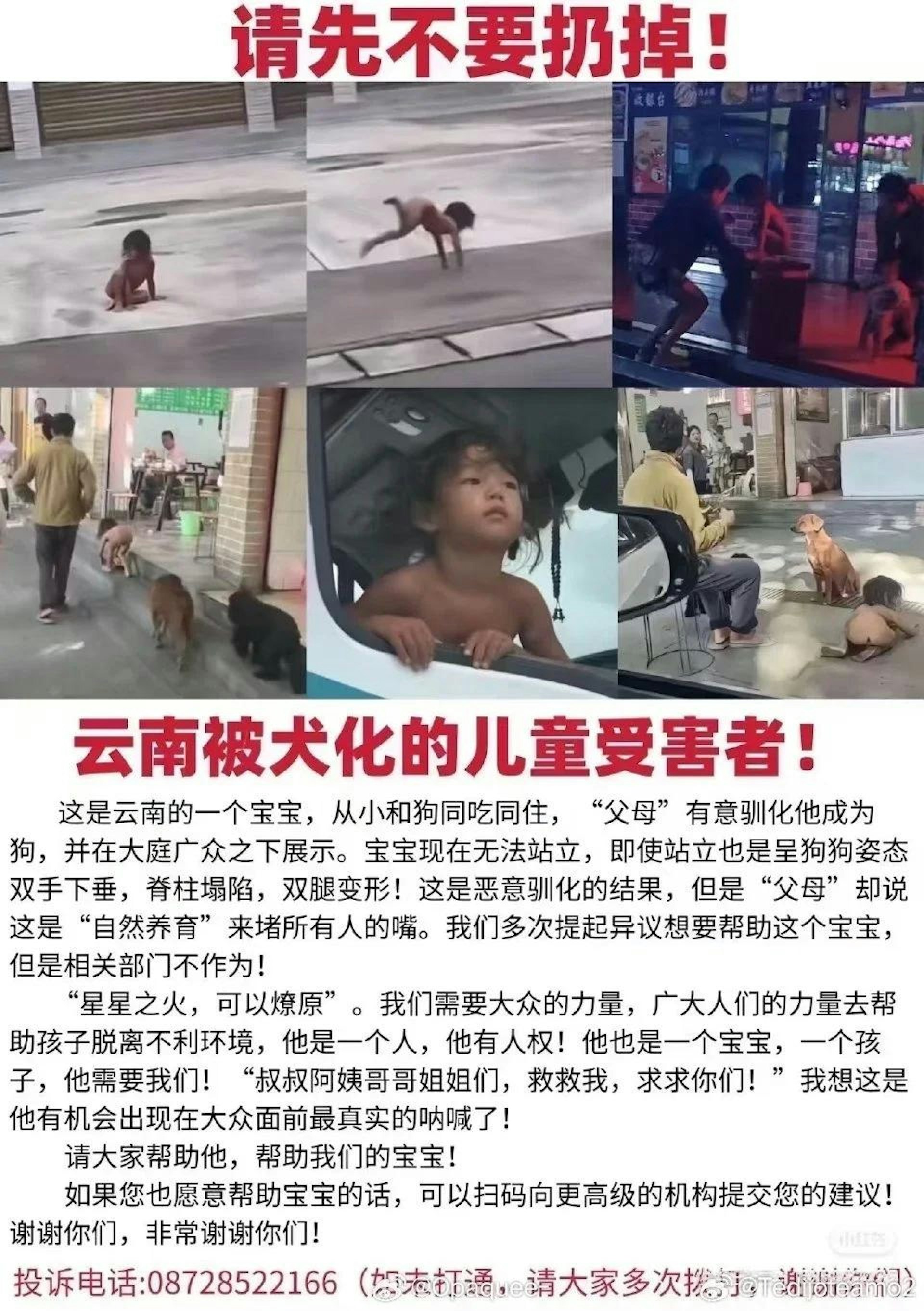 今年10月,有網民開車經過四川一高速公路服務區意外發現一名「野人小孩」,他渾身赤裸、頭髮凌亂、手腳並用跑動,亦有網民稱他為「犬孩」。孩子居住地宣傳部回應稱,孩子的父親是雲南南澗縣本地人,今年30多歲。新政村村民楊梅透露,孩子的父親一年四季都不給孩子穿衣服,村裡人曾報過警。