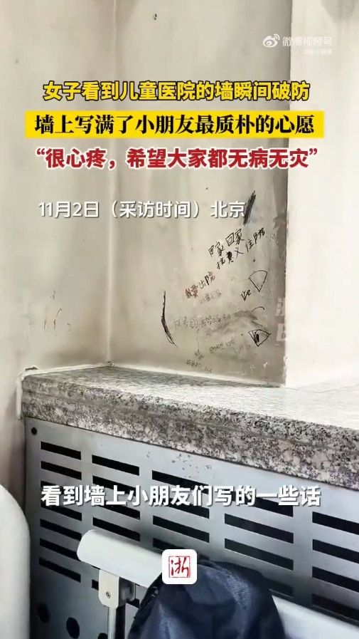 一間位於北京的兒童醫院,近日外牆上的塗鴉引起關注。有民眾路過時,發現牆上布滿字跡,起初以為是有心人士惡作劇亂塗鴉,但走進一看才驚覺,這些都是長期住院的病童所留下的願望。(微博@浙江日報)