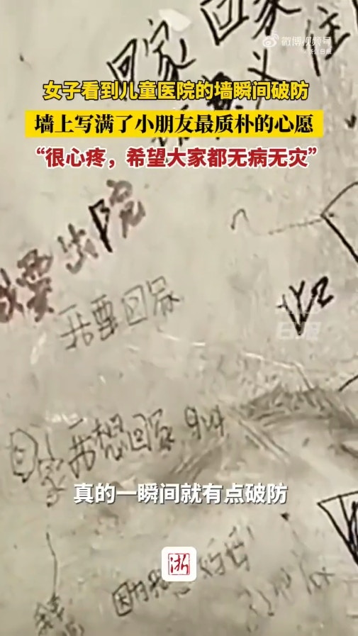 . i6 A# z1 O1 z( ~: ptvb now,tvbnow,bttvb據悉,一間位於北京的兒童醫院,近日外牆上的塗鴉引起關注。有民眾路過時,發現牆上布滿字跡,起初以為是有心人士惡作劇亂塗鴉,但走進一看才驚覺,這些都是長期住院的病童所留下的願望。這些小朋友由於身體因素,長期待在醫院治療,不能像一般的孩子一樣正常上學、回家,因此他們在醫院的牆上抒發心情,寫下:「我想回家」、「我要出院」、「我再也不要來這裡了」等字句。超暖心!中國小孩與母親走失狂哭 日本站務員發現後立即這樣做每天準時擺攤的老婆婆沒出現 暖心公安竭力追查 終成功救了她