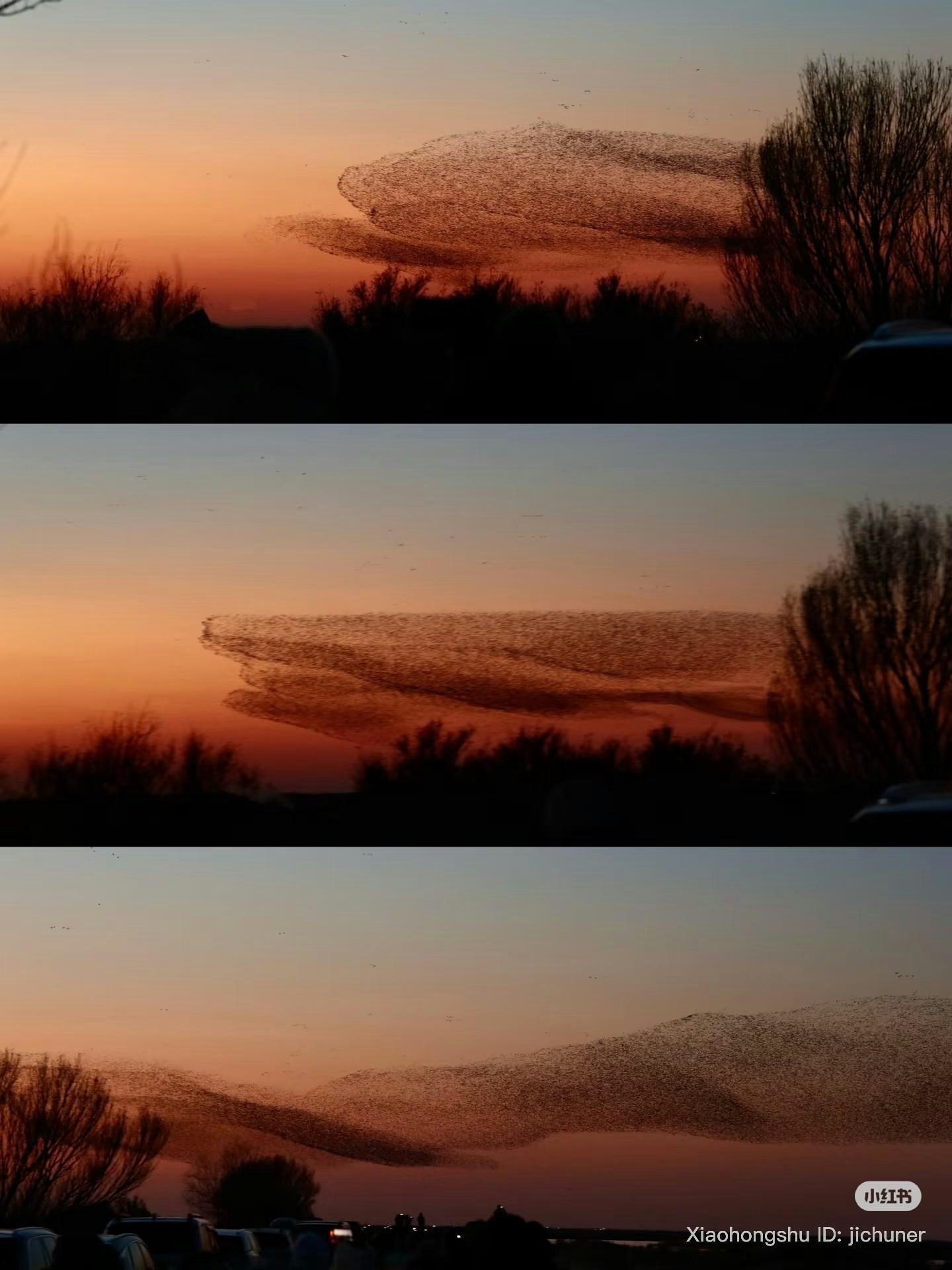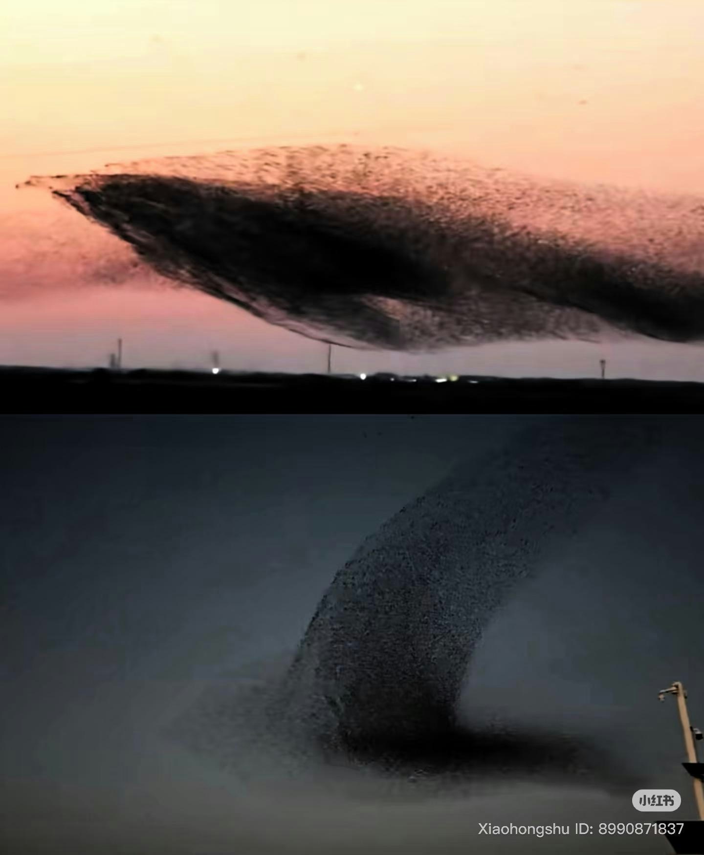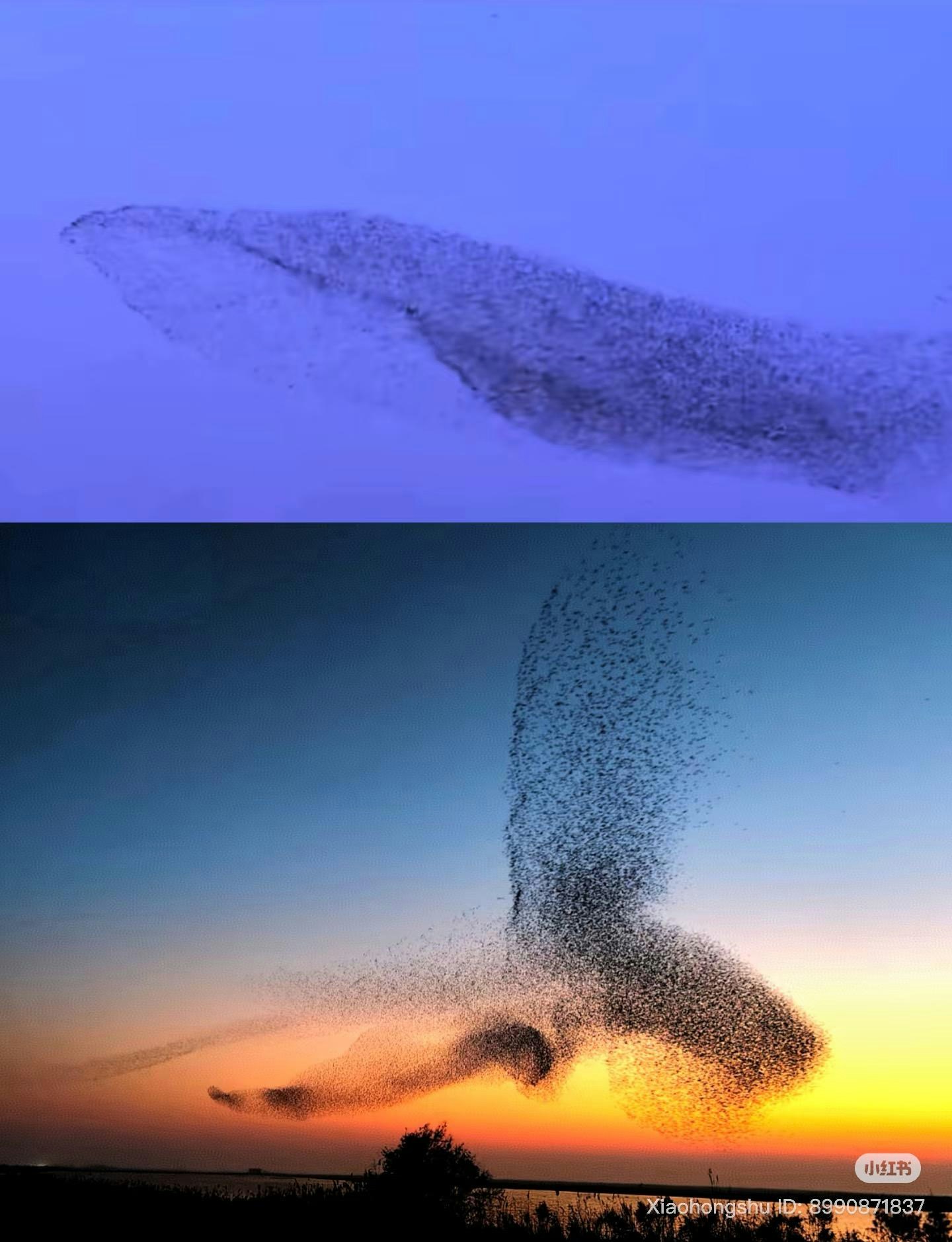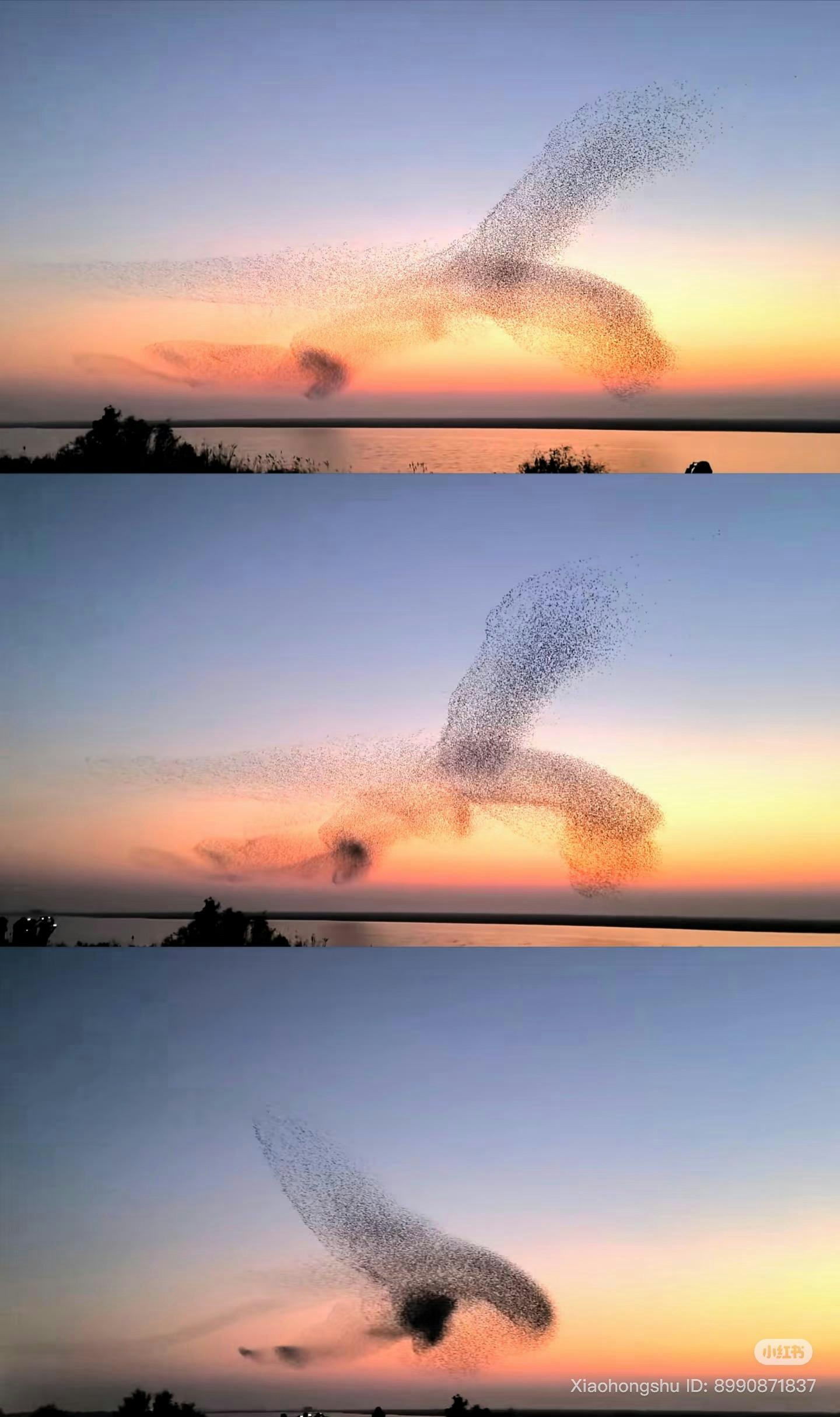 鳥群變化飛行陣型化身為如鯨魚般的形狀,有網民分享在小紅書認為重現莊子〈逍遙遊〉中「鯤鵬展翅」的奇觀。(小紅書)