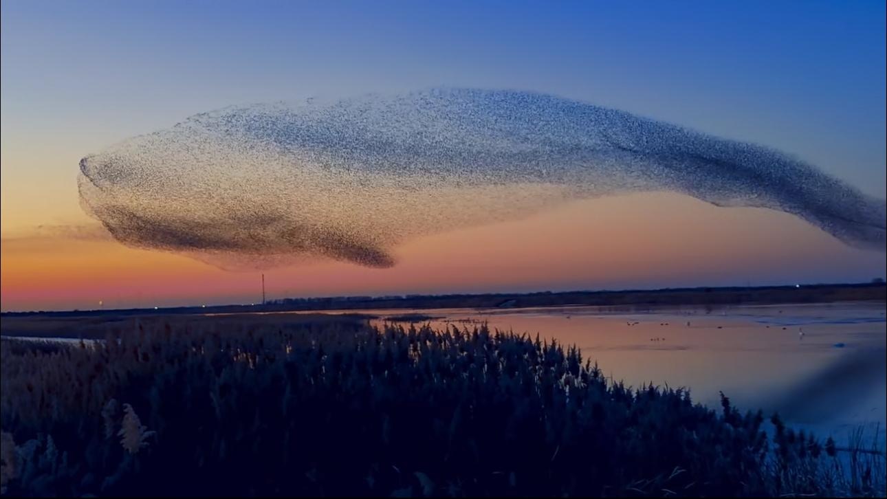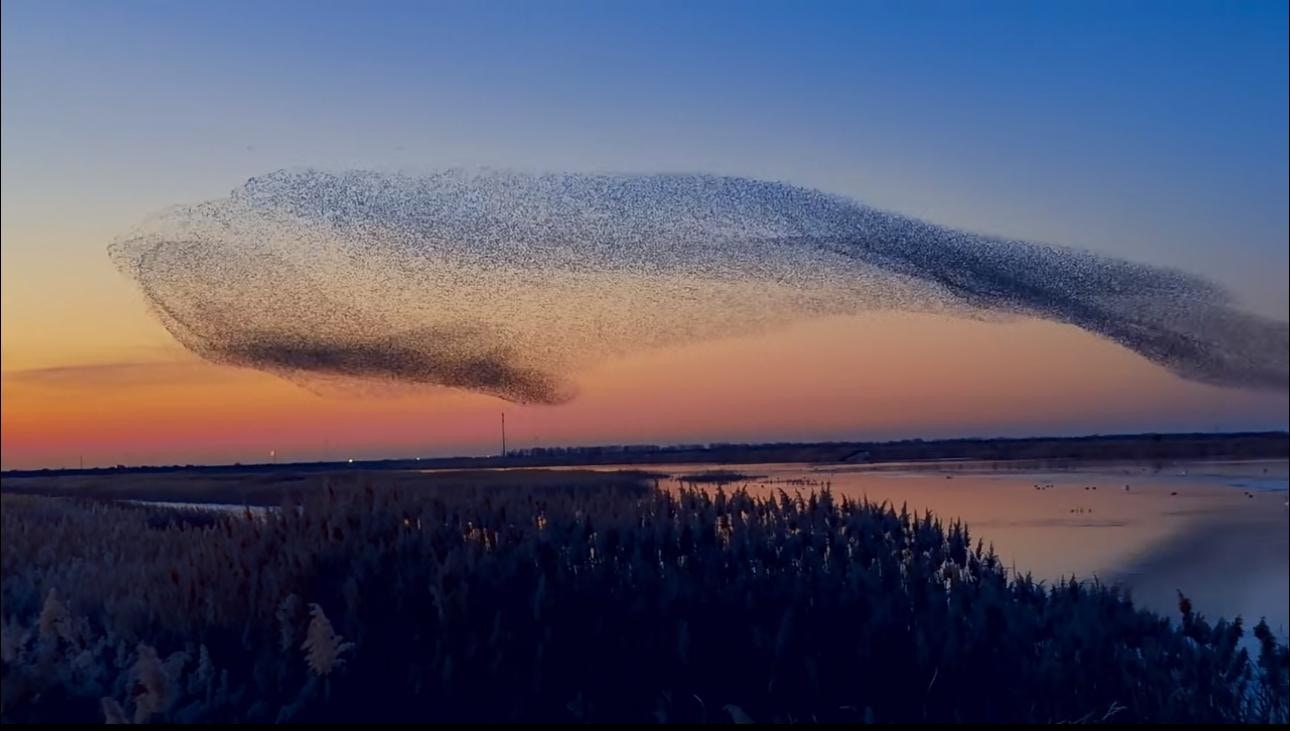 網傳影片可以看到,傍晚夕陽餘暉中,一群候鳥同時起飛,陣型不斷變化,有時聚合成巨鯨般,有時又像大鵬展翅,搭配暮色的金色光線,成為令人嘆為觀止的美景,不少遊客更在影片中發出驚嘆,稱簡直是現實版的《逍遙遊》。