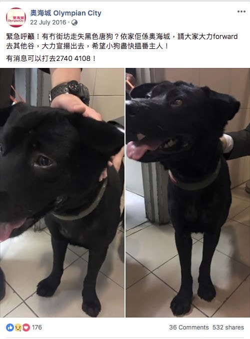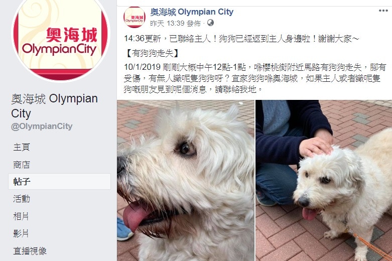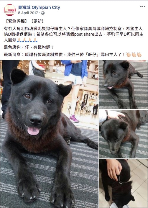 奧海城於2016年7月也助走失狗狗狗「豆豉」找回主人,獲網民大讚做到200分。(奧海城Facebook專頁)