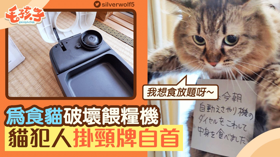 日本的一隻貓貓趁主人不在家時,竟然破壞了家中的餵糧機,並把機內儲存的糧食一次過吃光。該位寵主以網名「silverwolf5」在Twitter上分享此事,並公開貓貓的「自首照」。圖中的貓貓頸上掛有一個紙牌,牌上寫著:「今天早上,我弄壞了自動餵糧機並吃光了裏面的東西」。