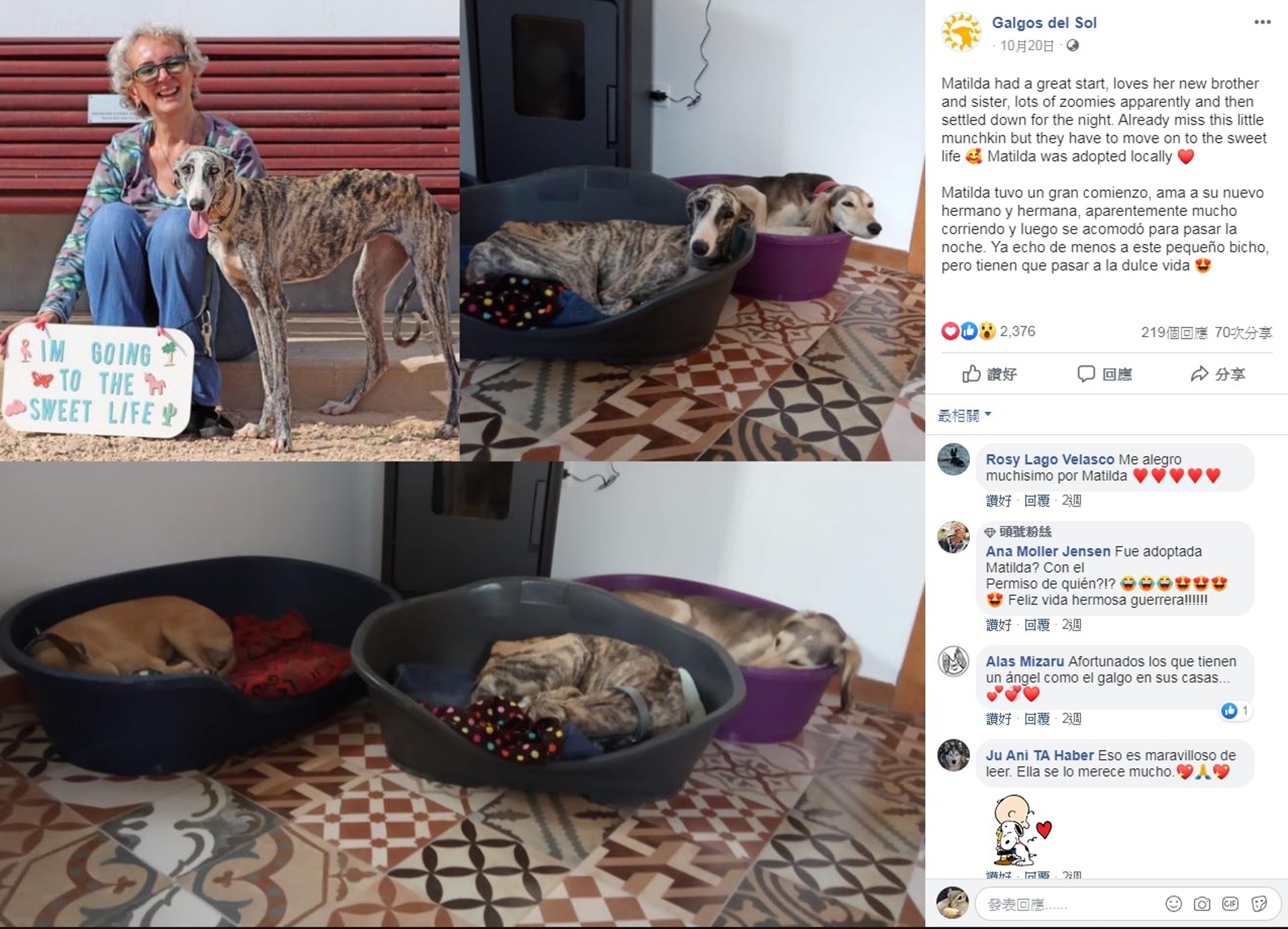 狗狗起初還怕陌生,但很快便適應。(FB@Galgos del Sol)