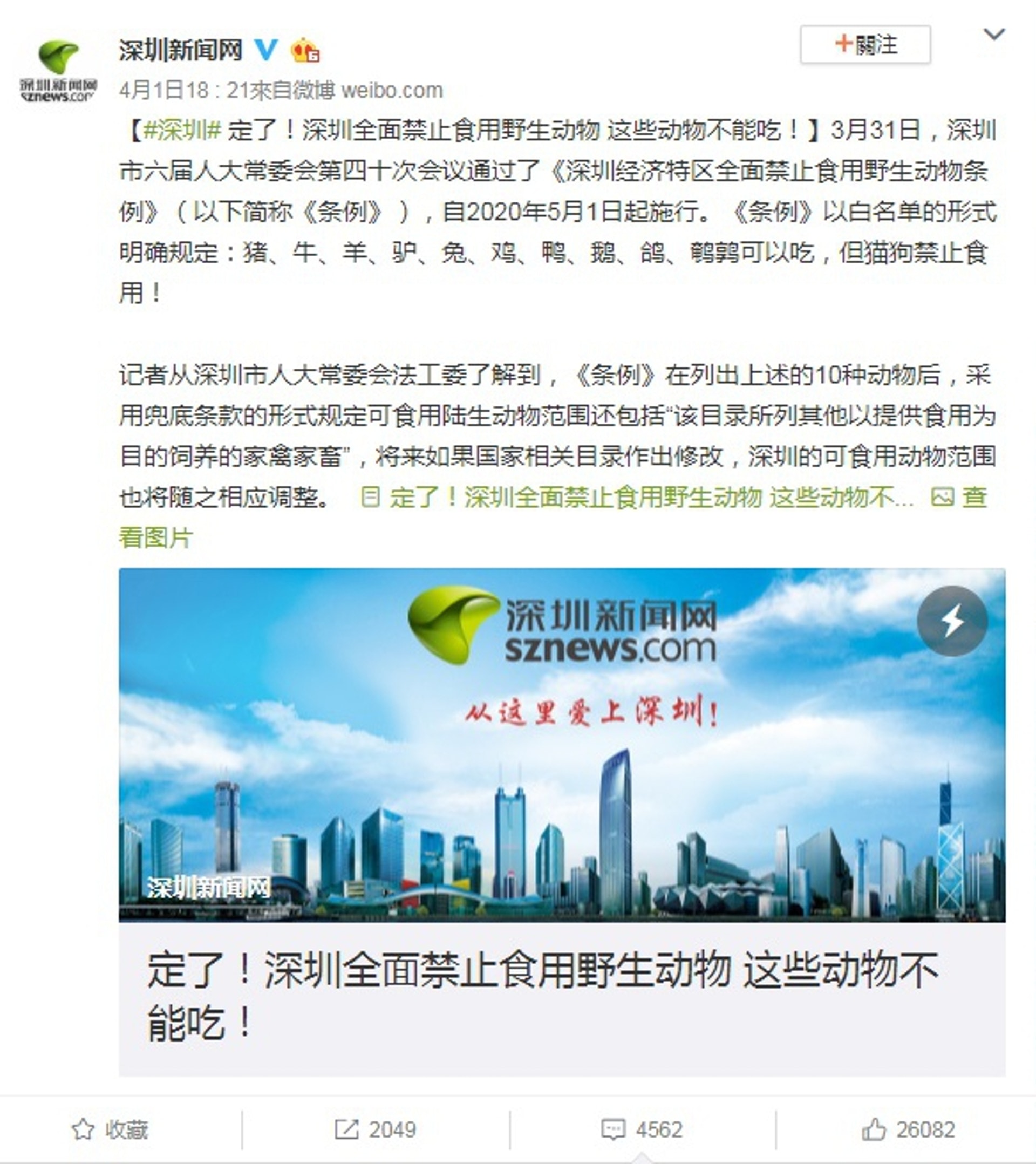 深圳在3月31日時,通過了《深圳經濟特區全面禁止食用野生動物條例》,自2020年5月1日起正式施行。當中明確表示,只有豬、牛、羊、驢、兔、雞、鴨、鵝、鴿、鵪鶉等可食用,而貓狗是禁止食肉。