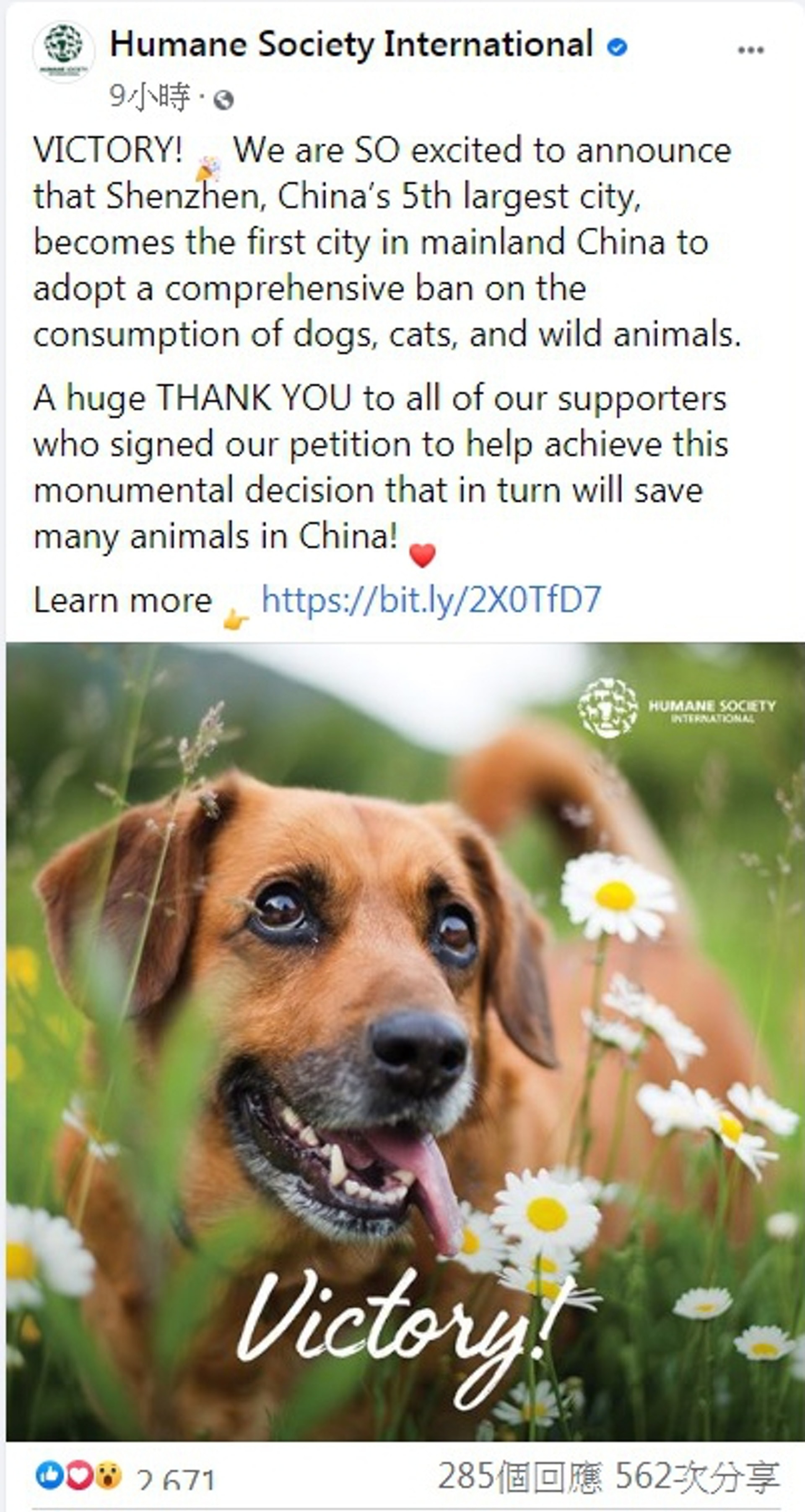 國際人道對待動物協會(Humane Society International, HSI)在收到深圳已通過條例禁吃貓狗消息後,已即時在Facebook社交平台上高興地表示,「這是重大的勝利!我們非常高興地宣布,中國第5大城市深圳,已成為中國大陸首個全面禁止吃狗、貓和野生動物的城市。非常感謝聯簽署請願的所有支持者,這是一個具有里程碑意義的決定,將會拯救許多在中國的動物!」