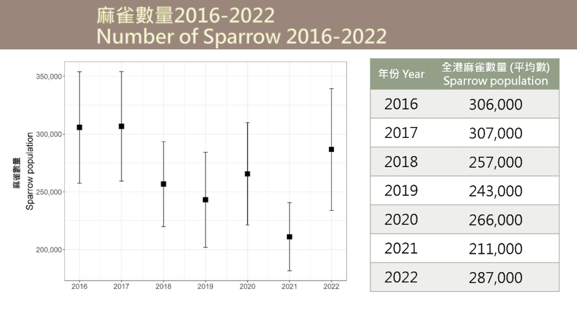 其實麻雀的數量由2016年的約30萬隻跌至2021年最少的21萬,情況一直令人擔憂。不過今年數字再度回升,「香港觀鳥會」會再多加留意氣候、食物多寡、疾病等因素,希望能找出成因,更有效地為「樹麻雀」進行保育。 |