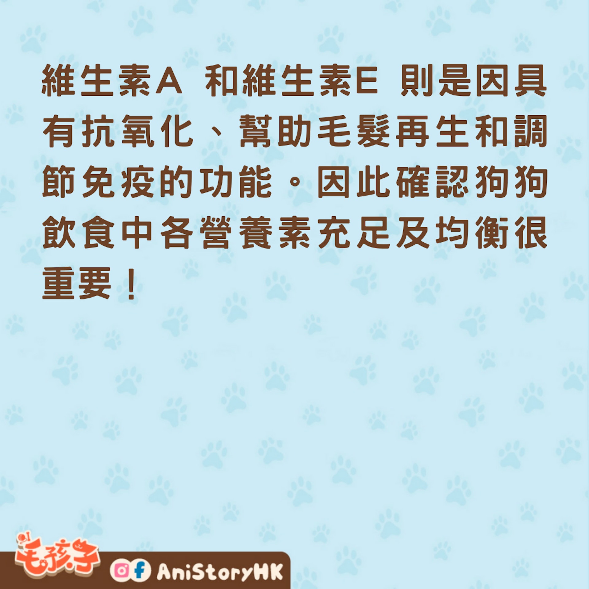 維生素A 和維生素E 則是因具有抗氧化、幫助毛髮再生和調節免疫的功能。因此確認狗狗飲食中各營養素充足及均衡很重要!