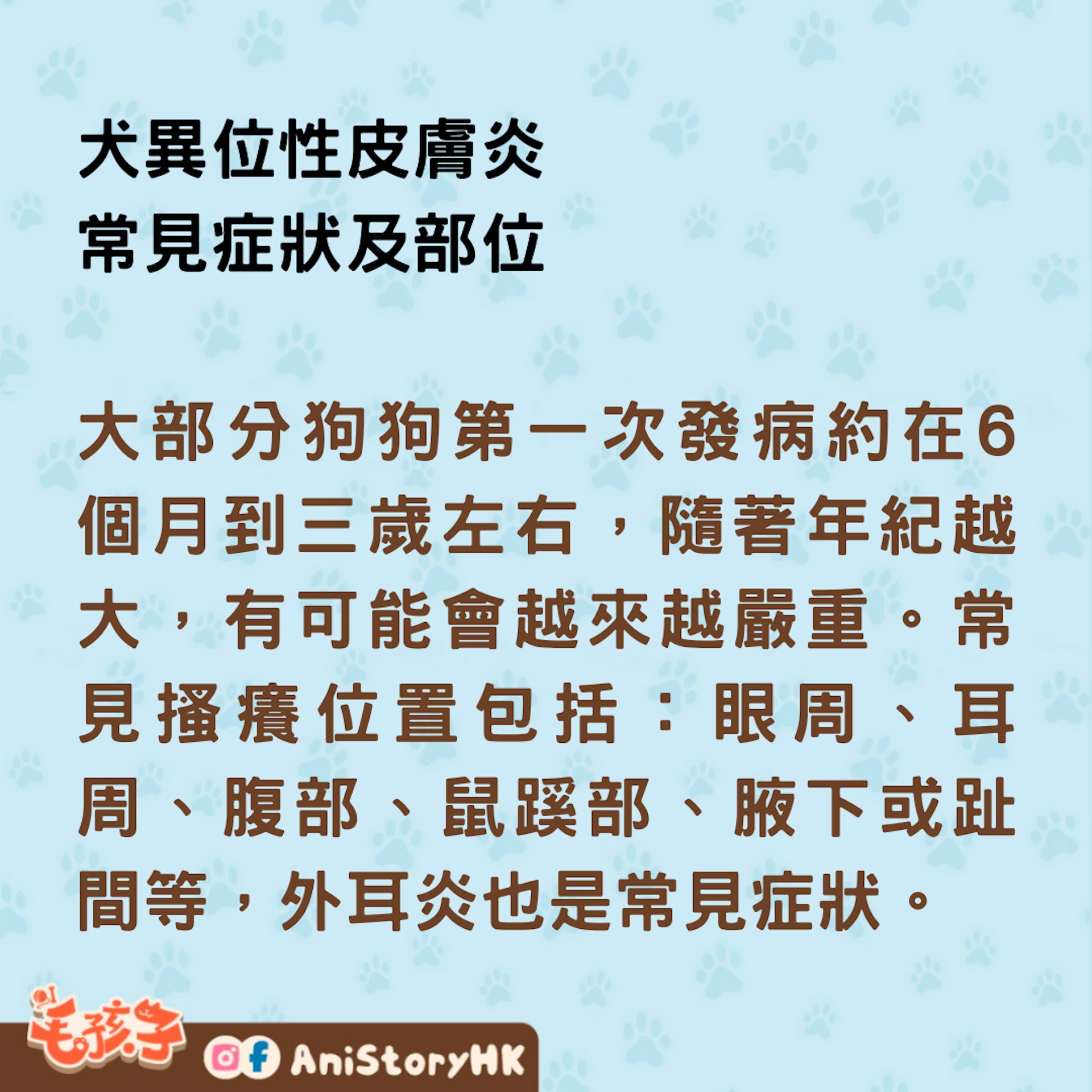 大部分狗狗第一次發病約在6 個月到三歲左右,隨著年紀越大,有可能會越來越嚴重。常見搔癢位置包括:眼周、耳周、腹部、鼠蹊部、腋下或趾間等,外耳炎也是常見症狀。