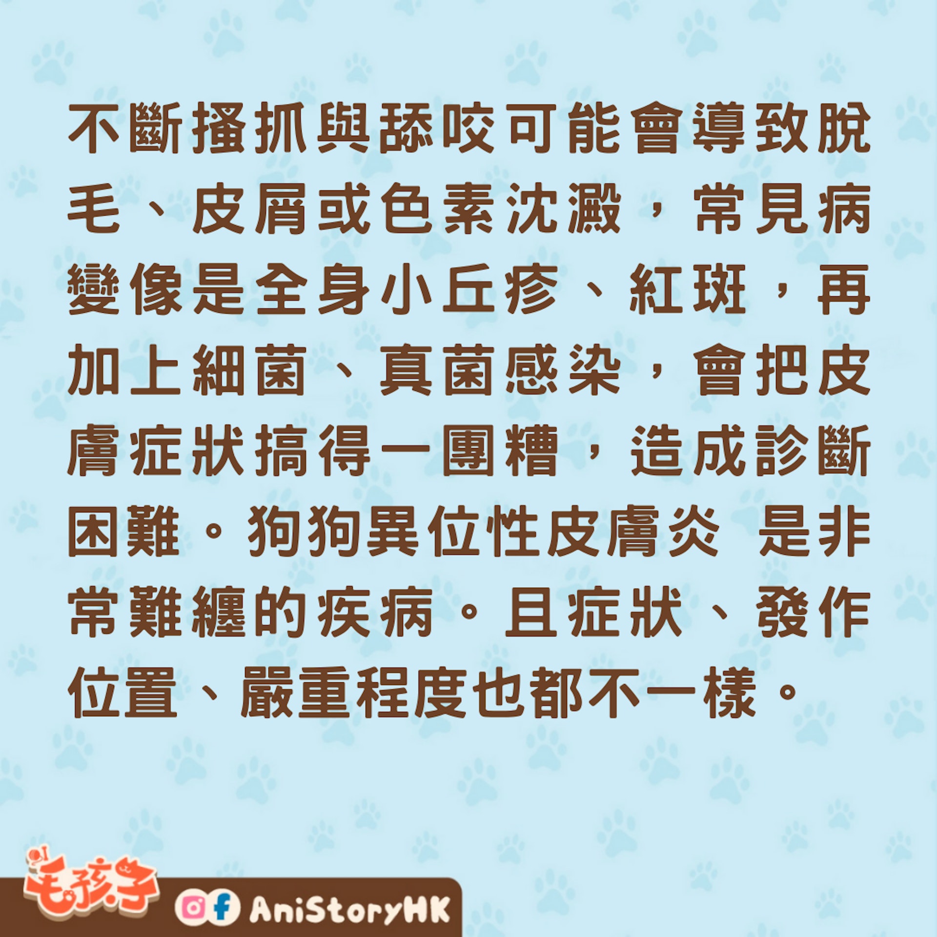 不斷搔抓與舔咬可能會導致脫毛、皮屑或色素沈澱,常見病變像是全身小丘疹、紅斑,再加上細菌、真菌感染,會把皮膚症狀搞得一團糟,造成診斷困難。 狗狗異位性皮膚炎 是非常難纏的疾病。且症狀、發作位置、嚴重程度也都不一樣。