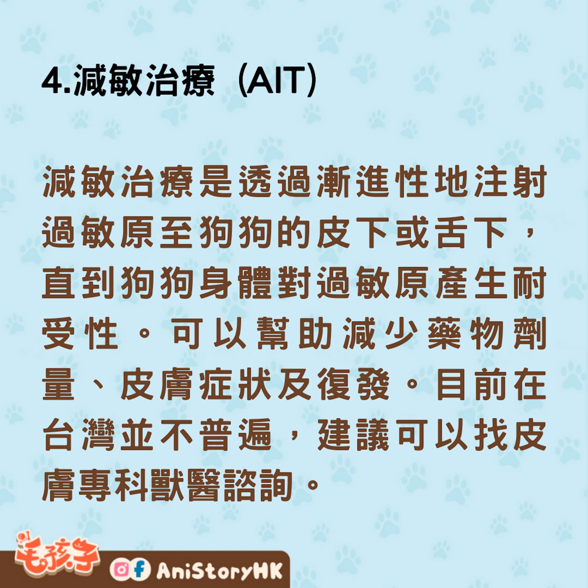 減敏治療是透過漸進性地注射過敏原至狗狗的皮下或舌下,直到狗狗身體對過敏原產生耐受性。可以幫助減少藥物劑量、皮膚症狀及復發。目前在台灣並不普遍,建議可以找皮膚專科獸醫諮詢。