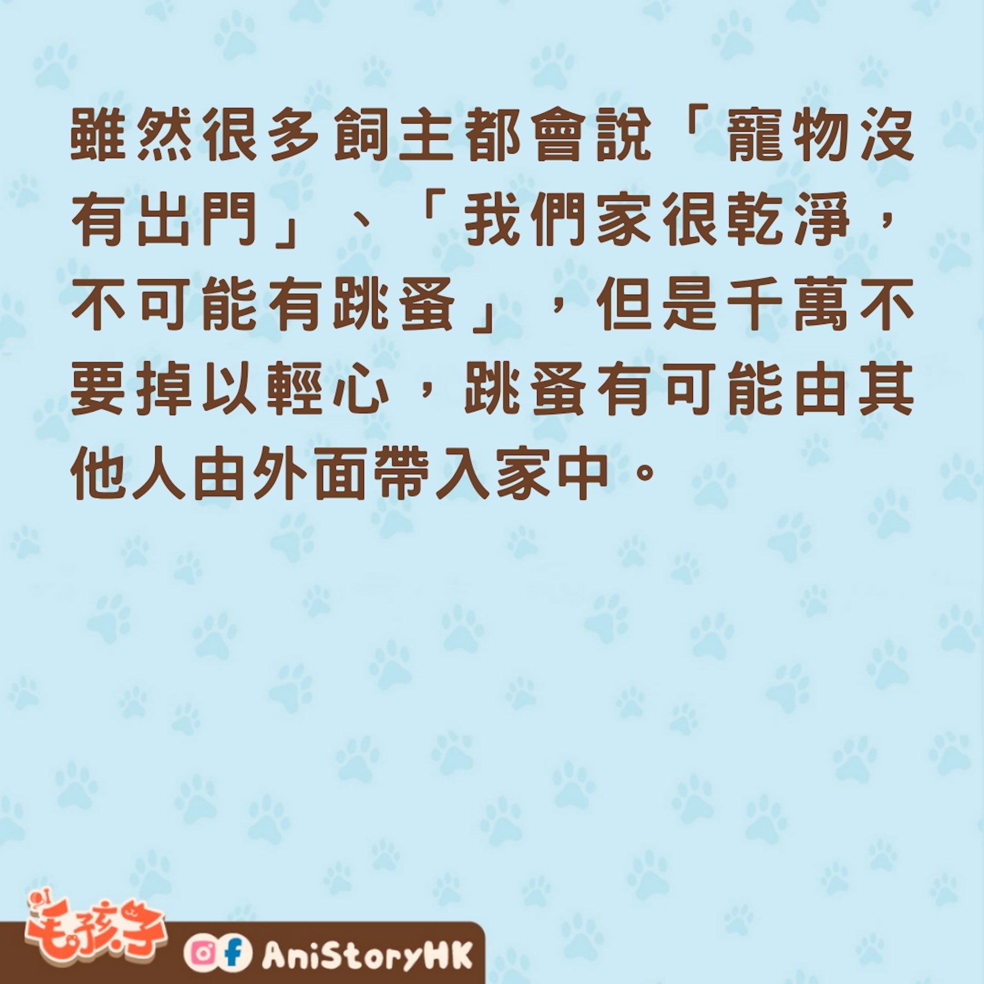 跳蚤是很常見的搔癢來源,除了叮咬帶來的搔癢外,也有很多是跳蚤造成的過敏反應。雖然很多飼主都會說「寵物沒有出門」、「我們家很乾淨,不可能有跳蚤」,但是千萬不要掉以輕心,跳蚤有可能由其他人由外面帶入家中。
