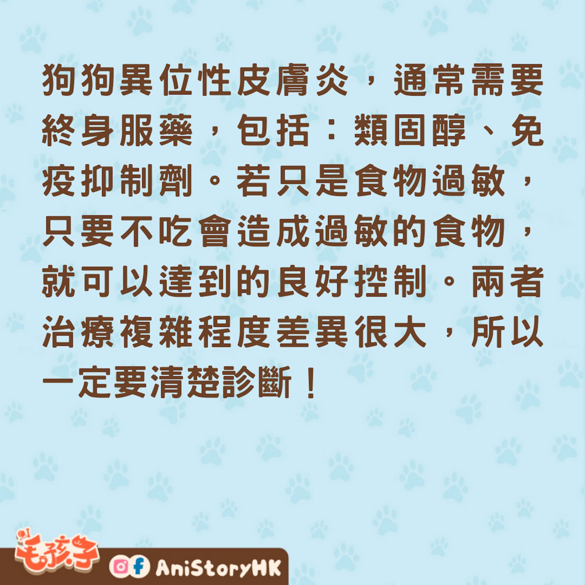 狗狗異位性皮膚炎,通常需要終身服藥,包括:類固醇、免疫抑制劑。若只是食物過敏,只要不吃會造成過敏的食物,就可以達到的良好控制。兩者治療複雜程度差異很大,所以一定要清楚診斷!