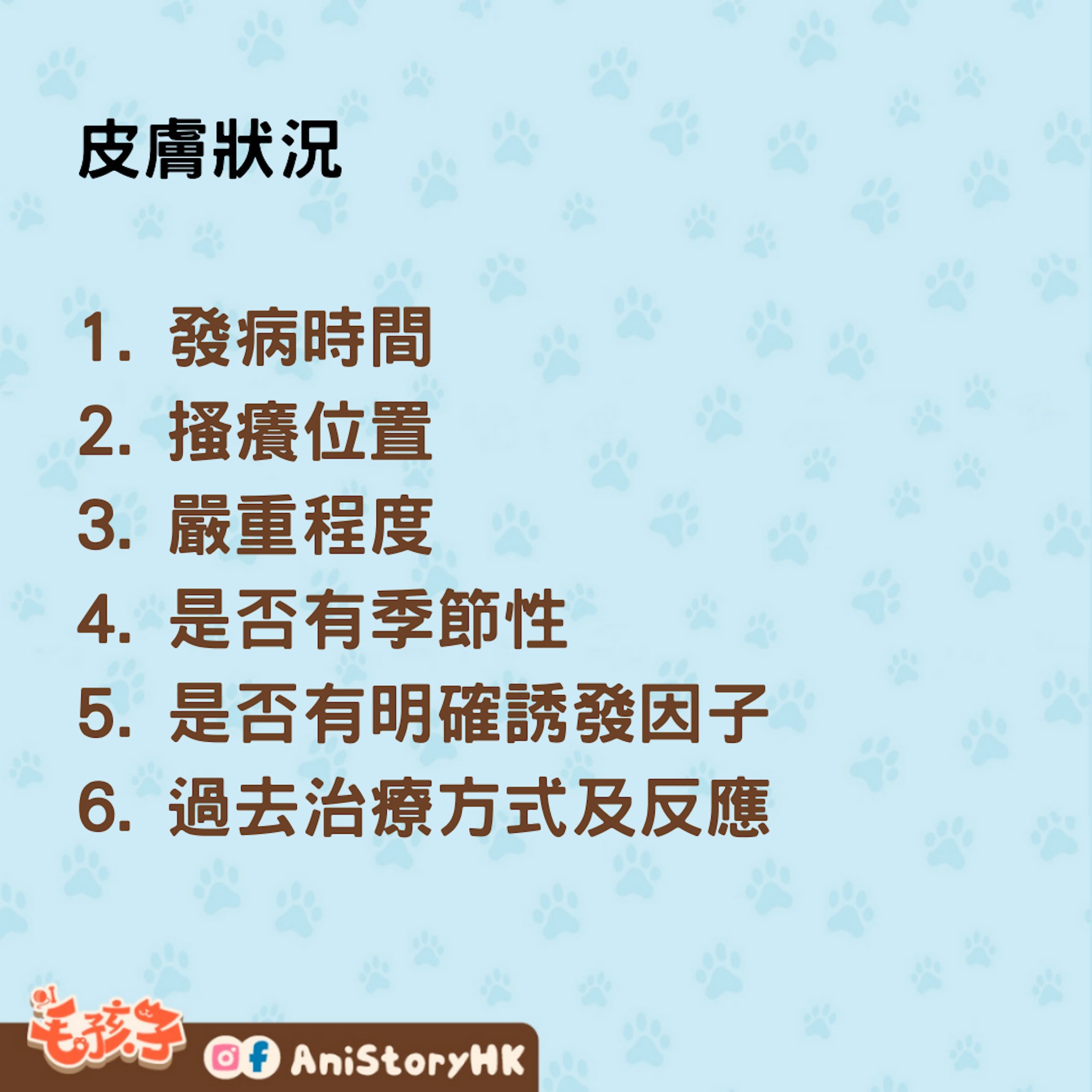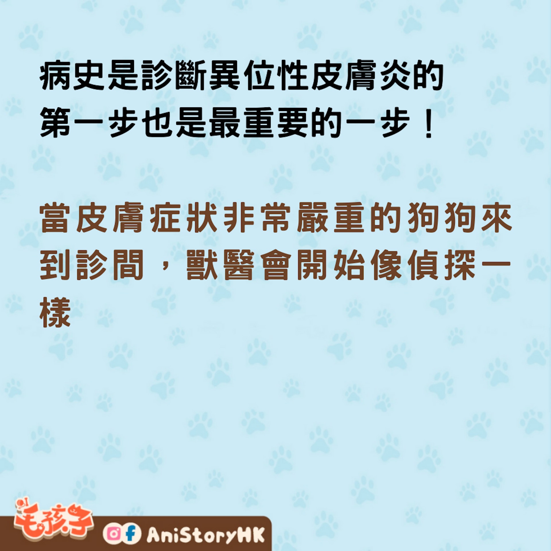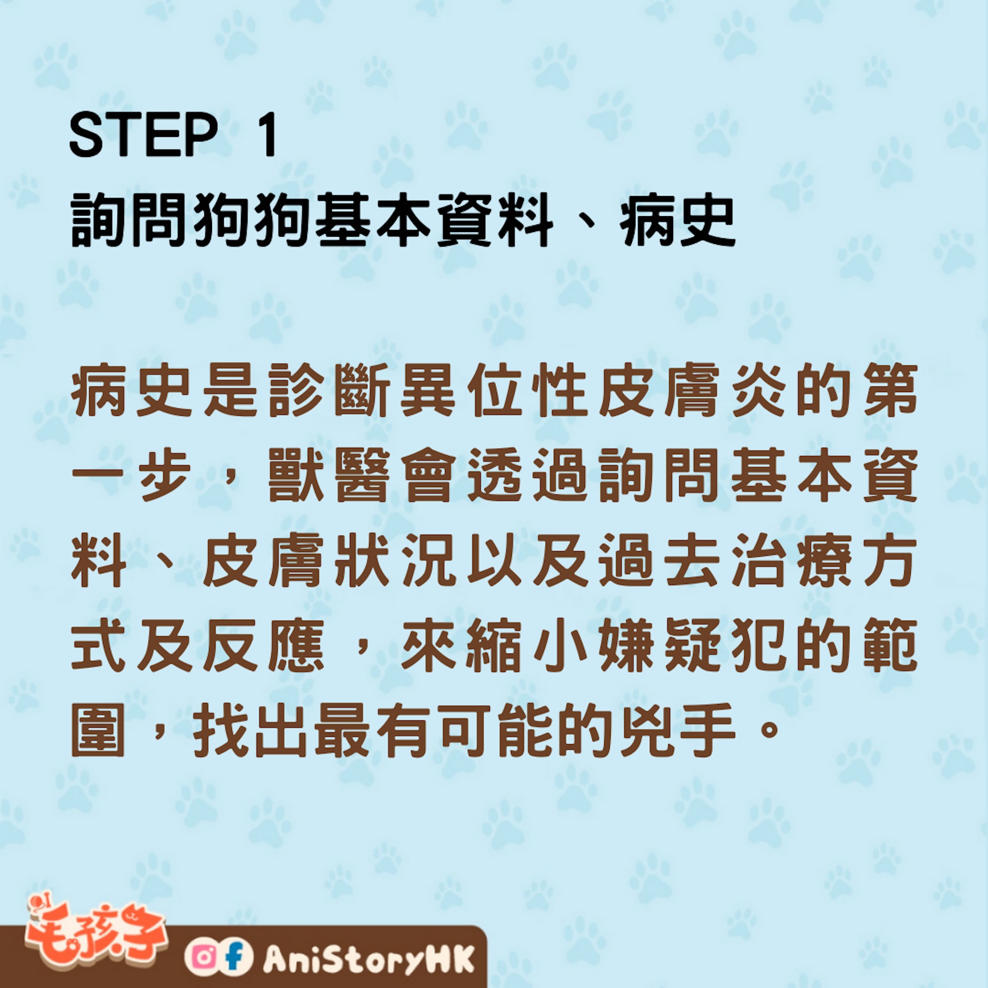 病史是診斷異位性皮膚炎的第一步,獸醫會透過詢問基本資料、皮膚狀況以及過去治療方式及反應,來縮小嫌疑犯的範圍,找出最有可能的兇手。