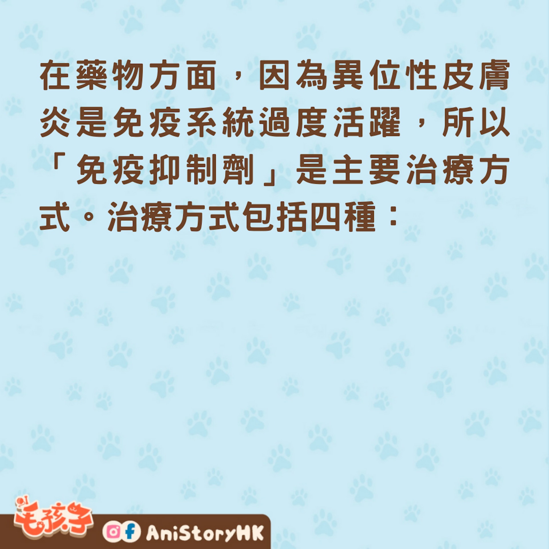 在藥物方面,因為異位性皮膚炎是免疫系統過度活躍,所以「免疫抑制劑」是主要治療方式。治療方式包括四種: