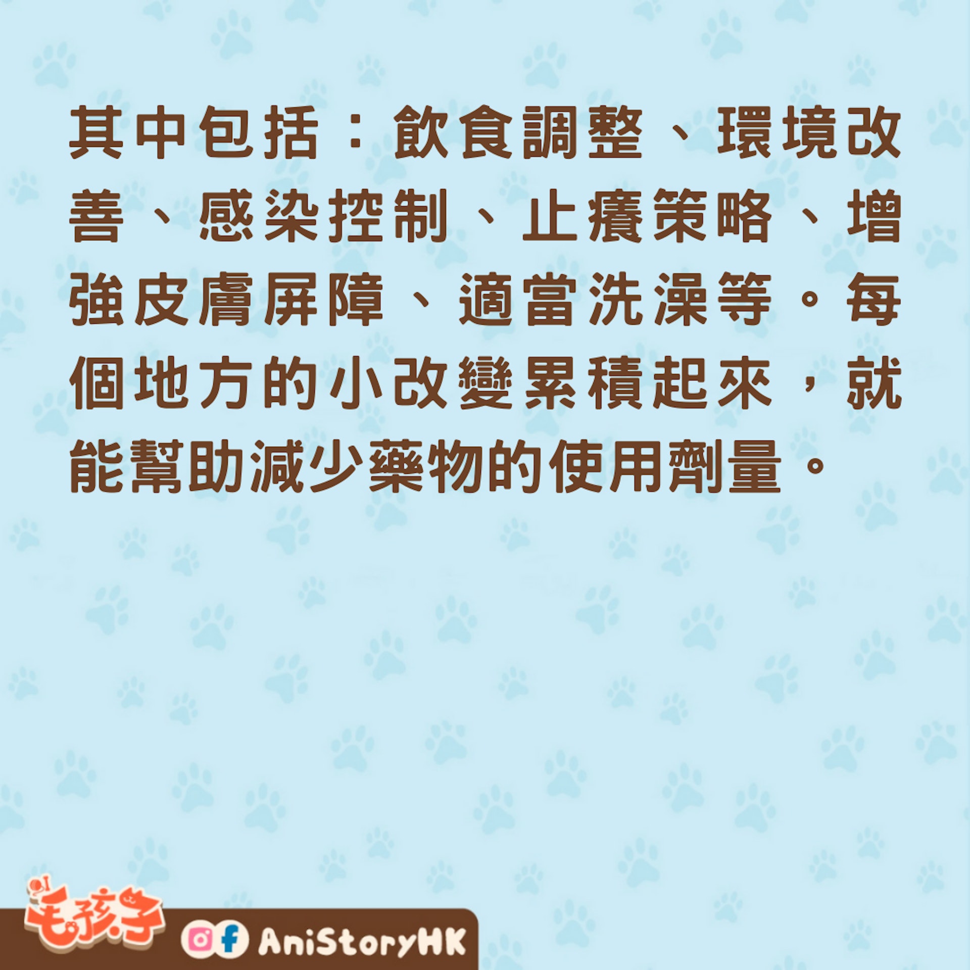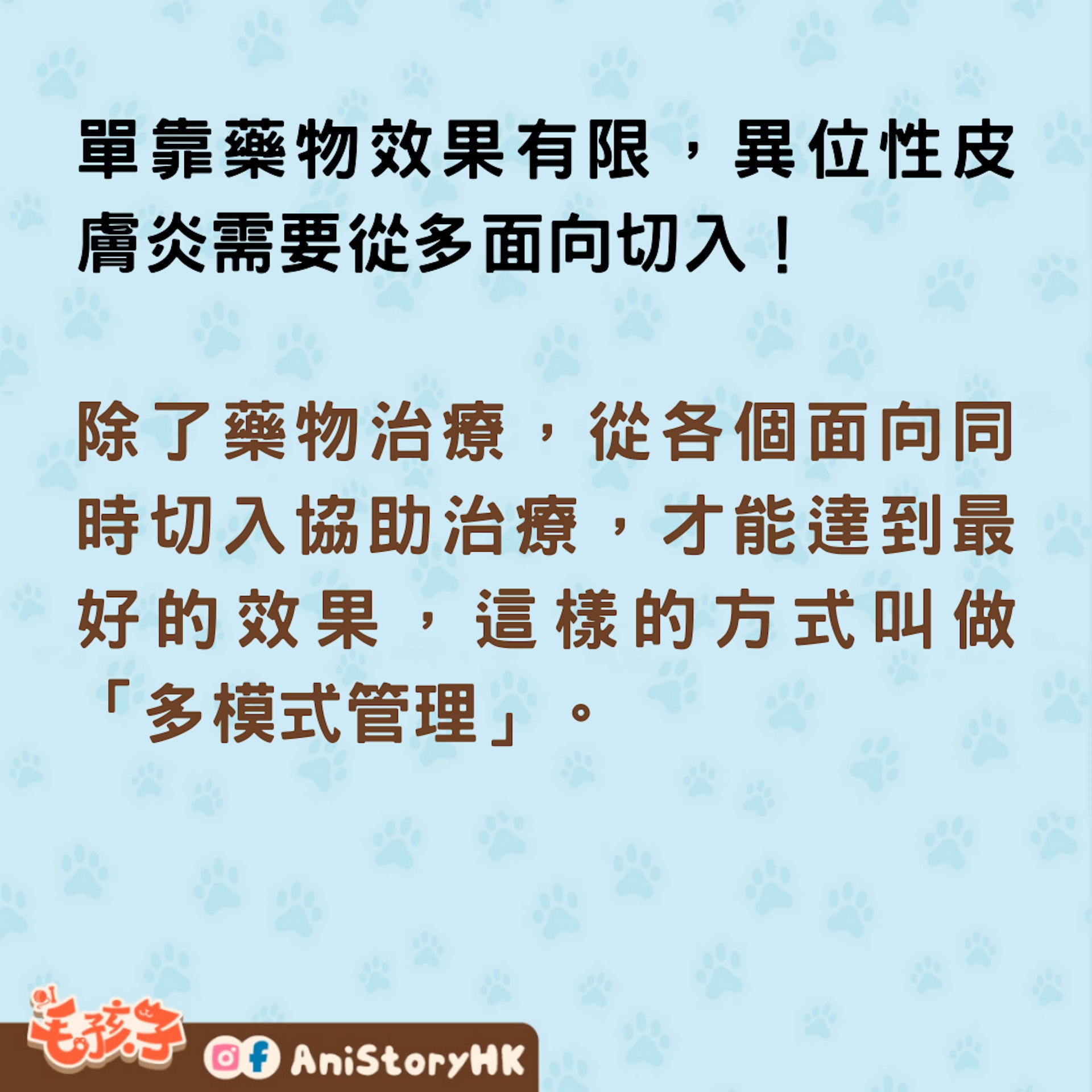 除了藥物治療,從各個面向同時切入協助治療,才能達到最好的效果,這樣的方式叫做「多模式管理」。其中包括:飲食調整、環境改善、感染控制、止癢策略、增強皮膚屏障、適當洗澡等。每個地方的小改變累積起來,就能幫助減少藥物的使用劑量。