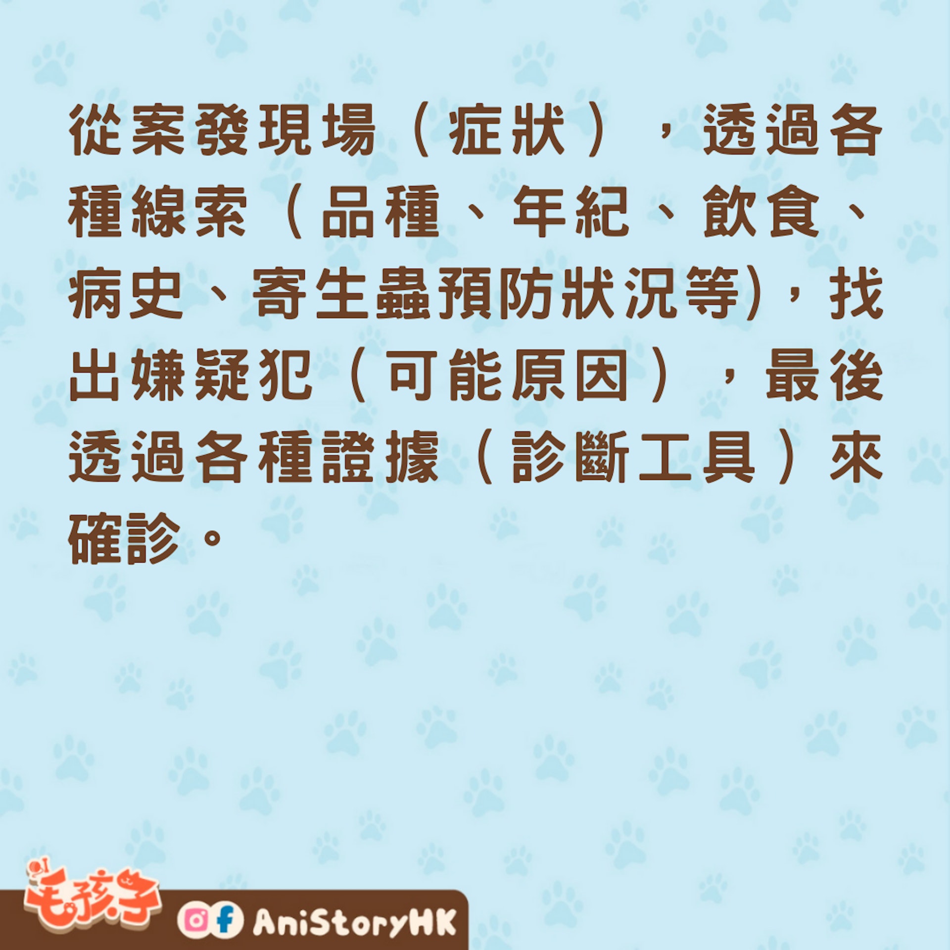 當皮膚症狀非常嚴重的狗狗來到診間,獸醫會開始像偵探一樣,從案發現場(症狀),透過各種線索(品種、年紀、飲食、病史、寄生蟲預防狀況等),找出嫌疑犯(可能原因),最後透過各種證據(診斷工具)來確診。