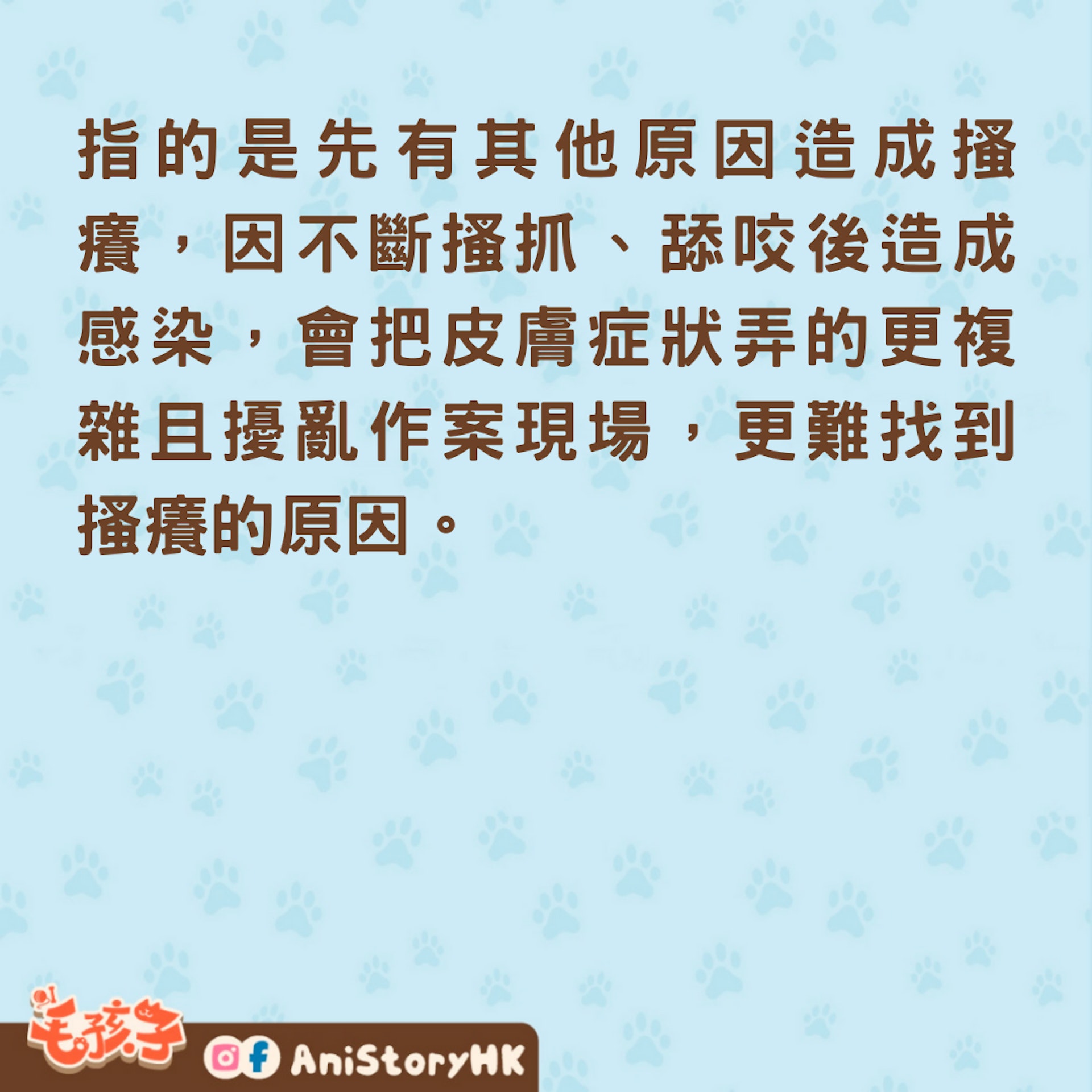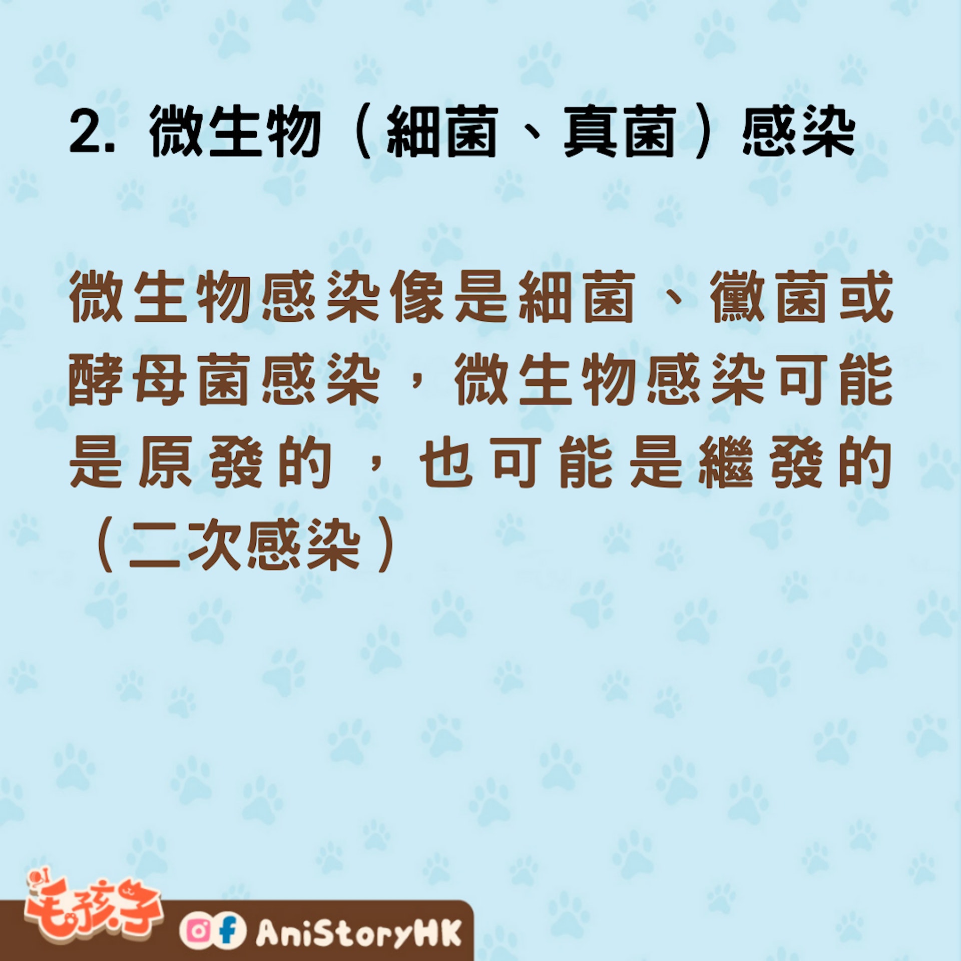 微生物感染像是細菌、黴菌或酵母菌感染,微生物感染可能是原發的,也可能是繼發的(二次感染),指的是先有其他原因造成搔癢,因不斷搔抓、舔咬後造成感染,會把皮膚症狀弄的更複雜且擾亂作案現場,更難找到搔癢的原因。