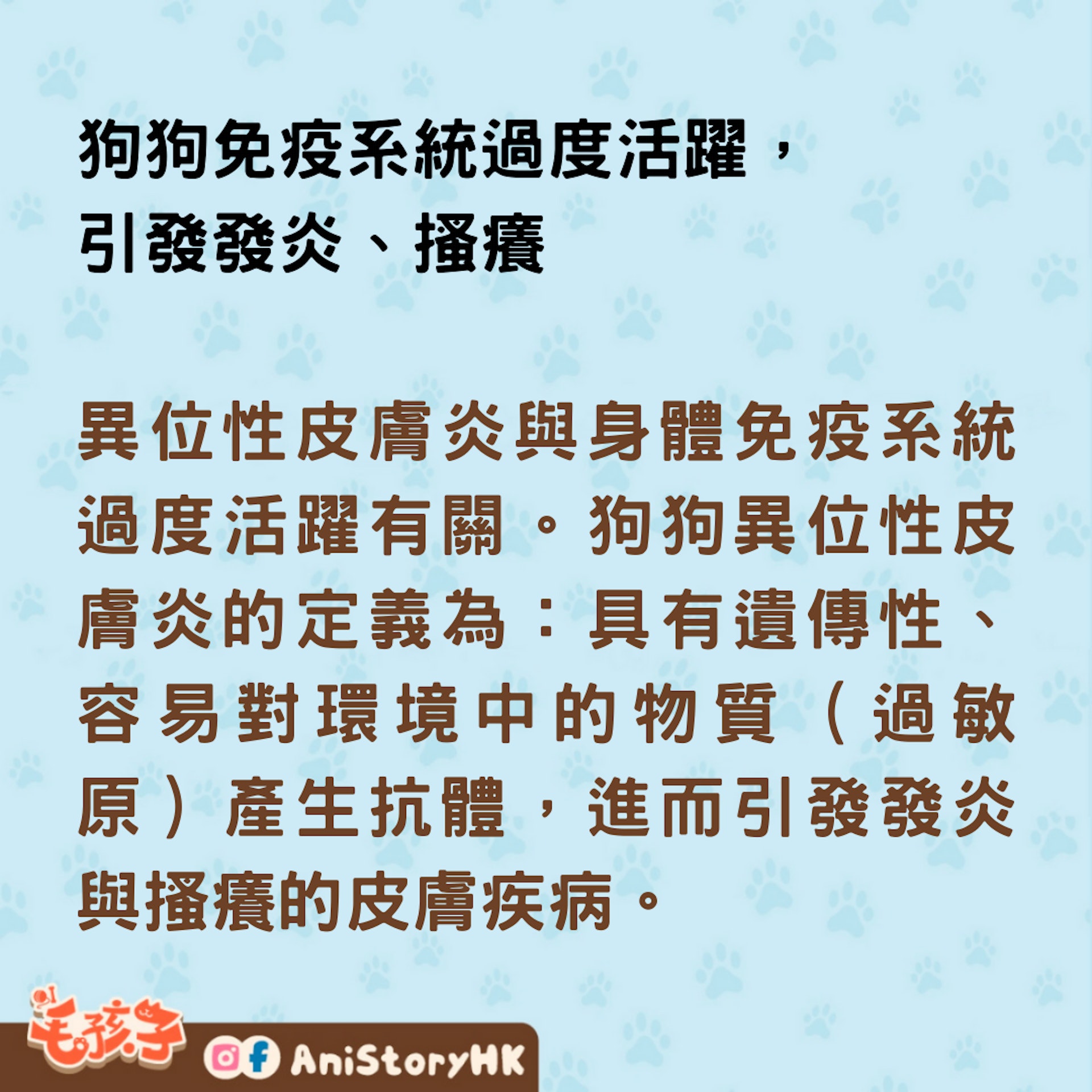 異位性皮膚炎與身體免疫系統過度活躍有關。狗狗異位性皮膚炎的定義為:具有遺傳性、容易對環境中的物質(過敏原)產生抗體,進而引發發炎與搔癢的皮膚疾病。