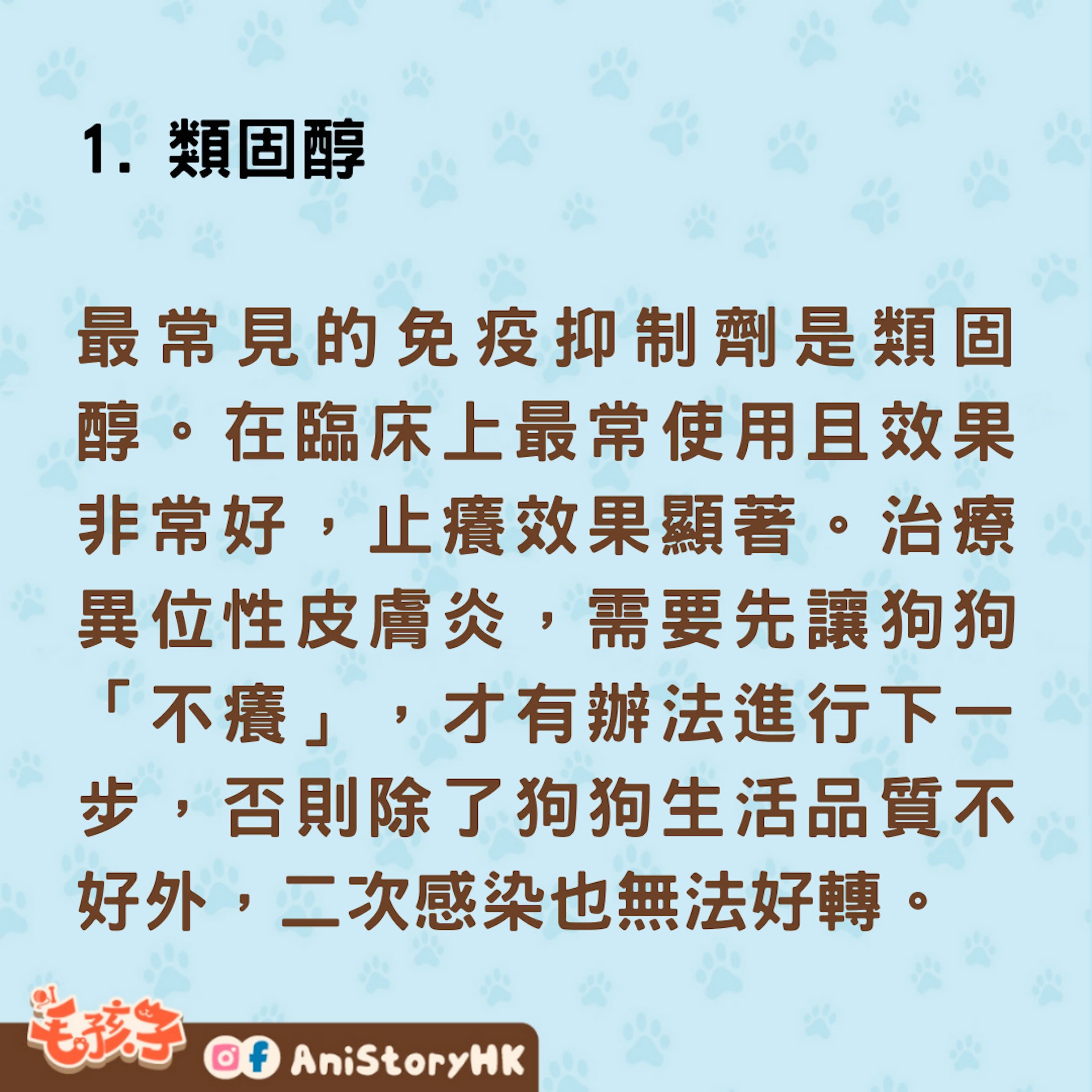 最常見的免疫抑制劑是類固醇。在臨床上最常使用且效果非常好,止癢效果顯著。治療異位性皮膚炎,需要先讓狗狗「不癢」,才有辦法進行下一步,否則除了狗狗生活品質不好外,二次感染也無法好轉。