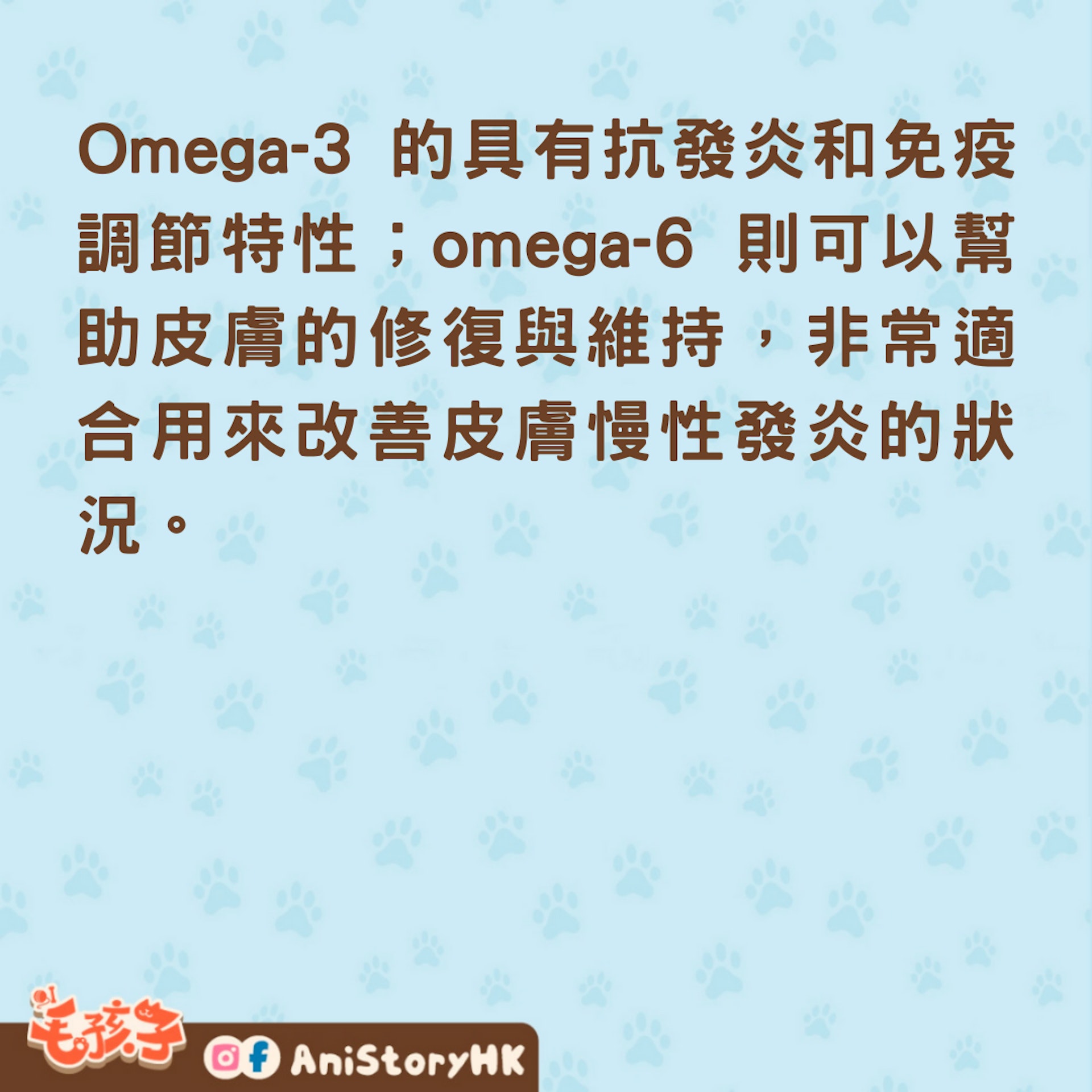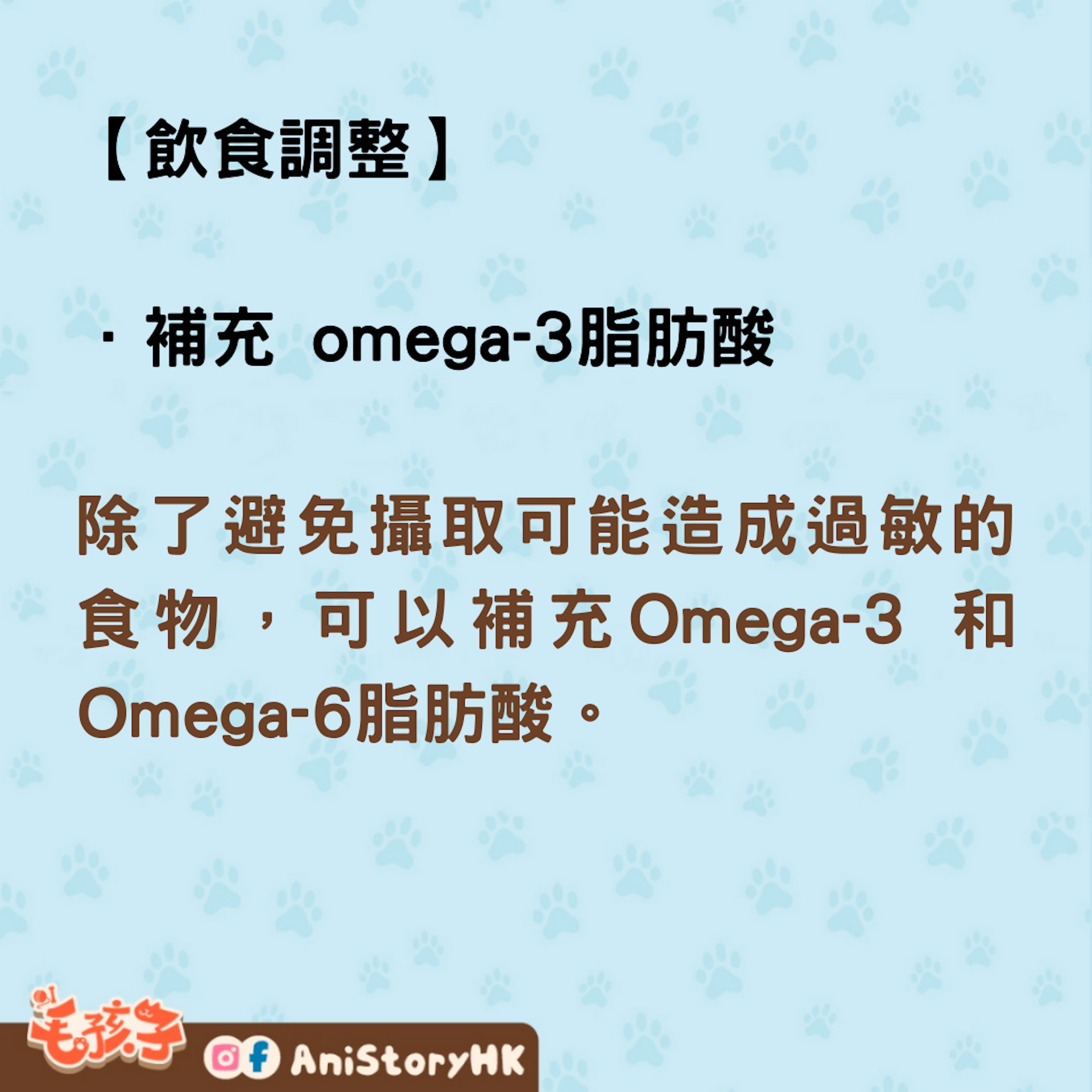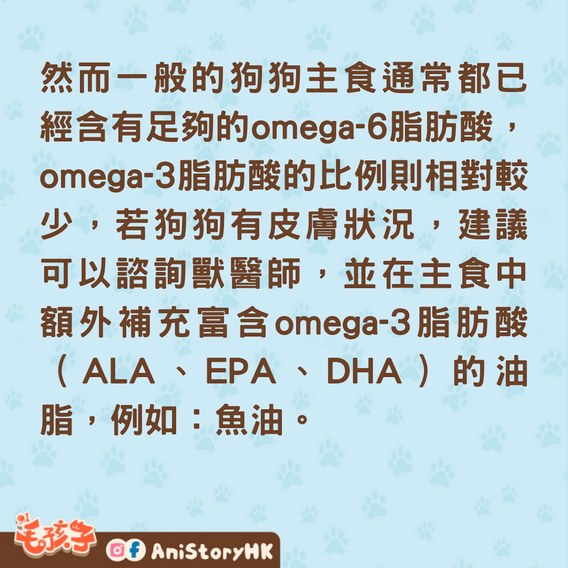 然而一般的狗狗主食通常都已經含有足夠的omega-6脂肪酸,omega-3脂肪酸的比例則相對較少,若狗狗有皮膚狀況,建議可以諮詢獸醫師,並在主食中額外補充富含omega-3脂肪酸(ALA、EPA、DHA)的油脂,例如:魚油。