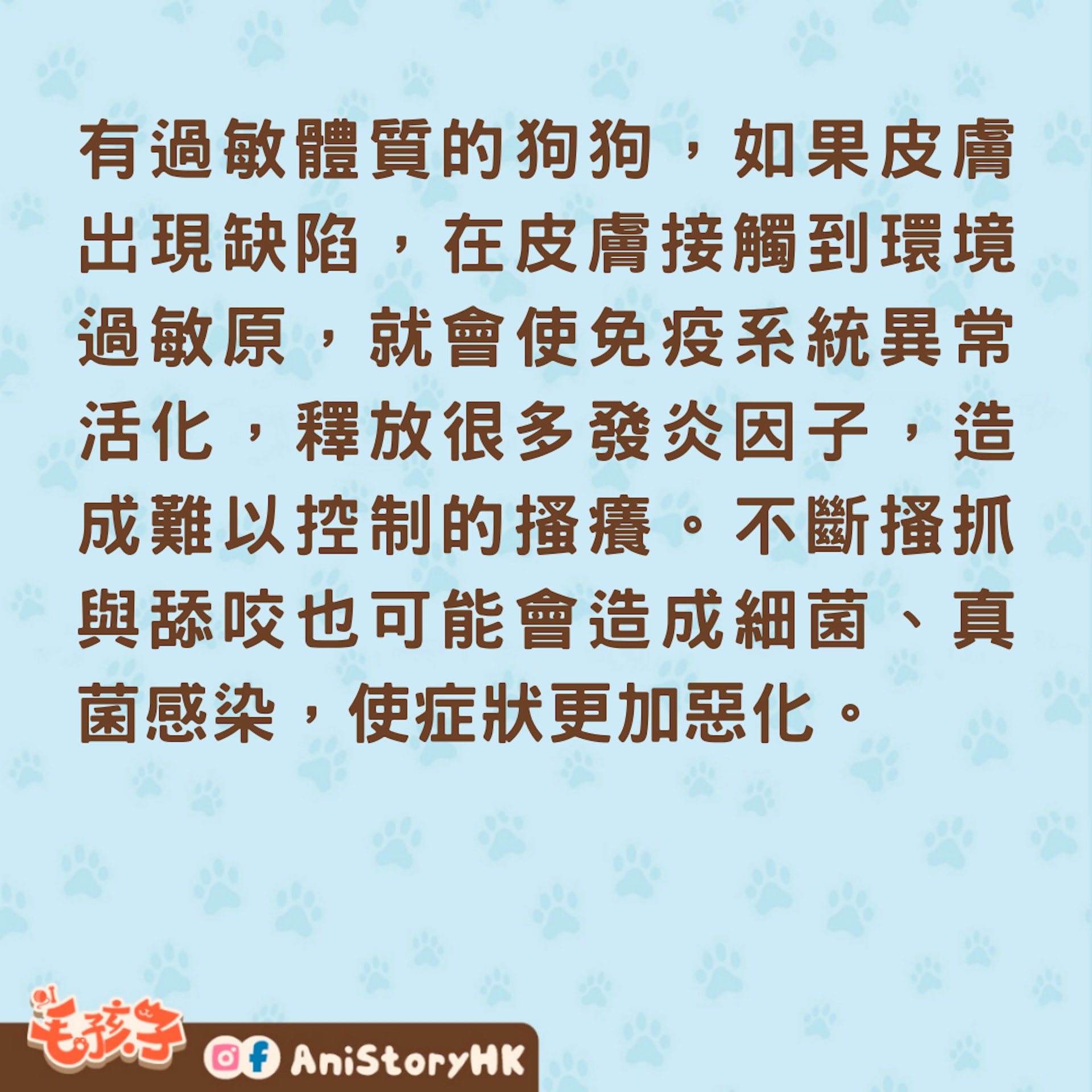有過敏體質的狗狗,如果皮膚出現缺陷,在皮膚接觸到環境過敏原,就會使免疫系統異常活化,釋放很多發炎因子,造成難以控制的搔癢。不斷搔抓與舔咬也可能會造成細菌、真菌感染,使症狀更加惡化。
