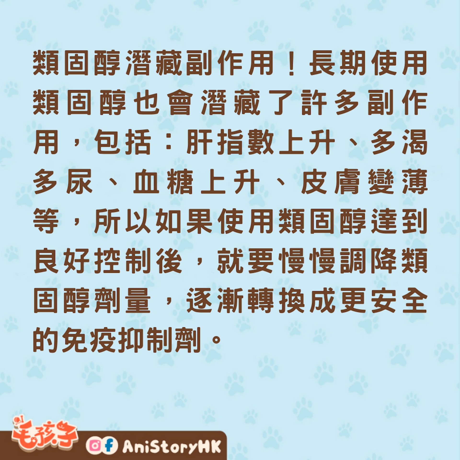 長期使用類固醇也會潛藏了許多副作用,包括:肝指數上升、多渴多尿、血糖上升、皮膚變薄等,所以如果使用類固醇達到良好控制後,就要慢慢調降類固醇劑量,逐漸轉換成更安全的免疫抑制劑。
