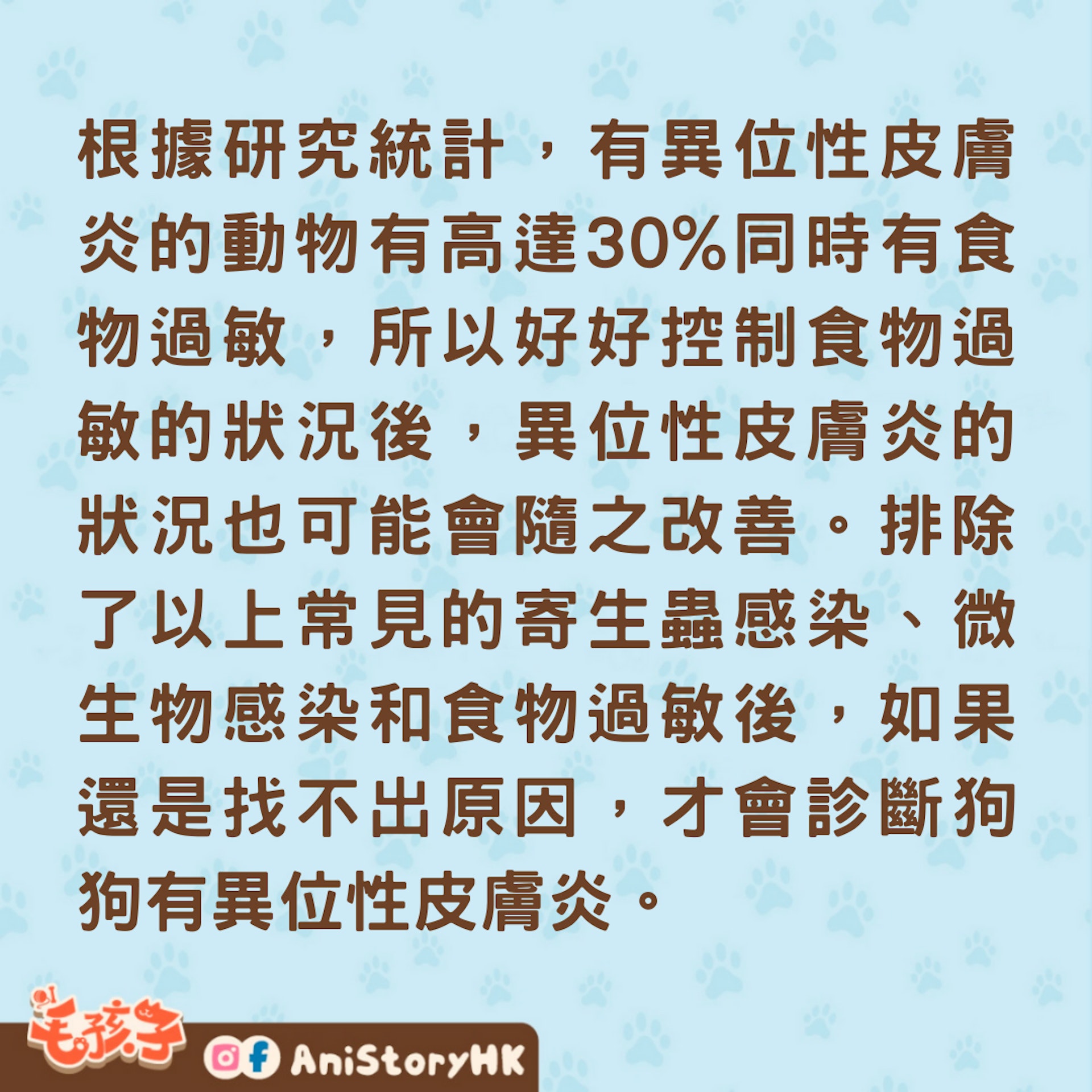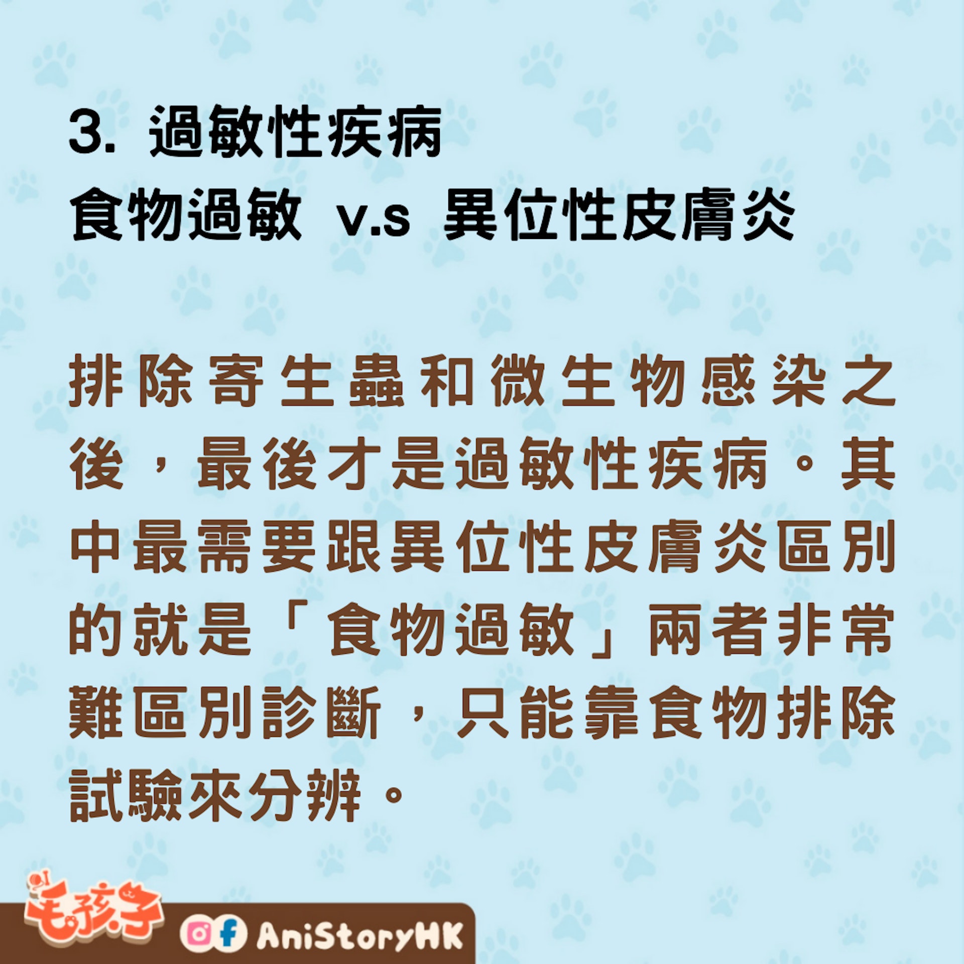 排除寄生蟲和微生物感染之後,最後才是過敏性疾病。其中最需要跟異位性皮膚炎區別的就是「食物過敏」兩者非常難區別診斷,只能靠食物排除試驗來分辨。