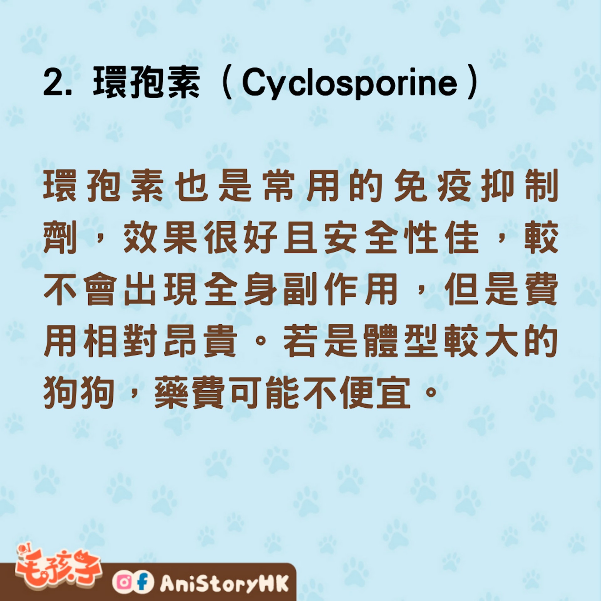 環孢素也是常用的免疫抑制劑,效果很好且安全性佳,較不會出現全身副作用,但是費用相對昂貴。若是體型較大的狗狗,藥費可能不便宜。