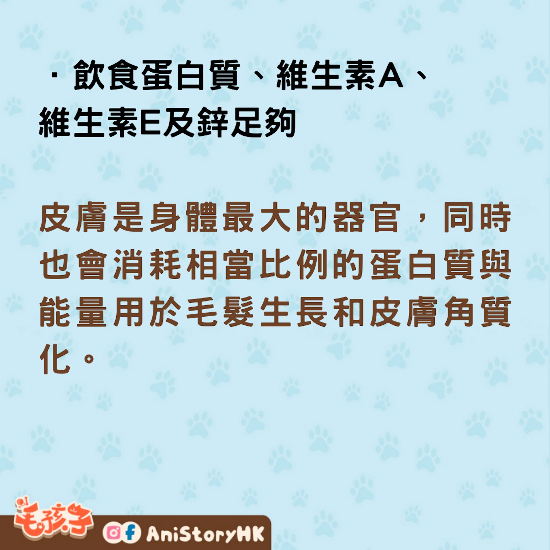 .飲食蛋白質、維生素A、維生素E及鋅足夠皮膚是身體最大的器官,同時也會消耗相當比例的蛋白質與能量用於毛髮生長和皮膚角質化。當蛋白質和能量不足時會導致角化異常、毛髮脫色及皮脂分泌異常,使皮膚更容易受到感染。