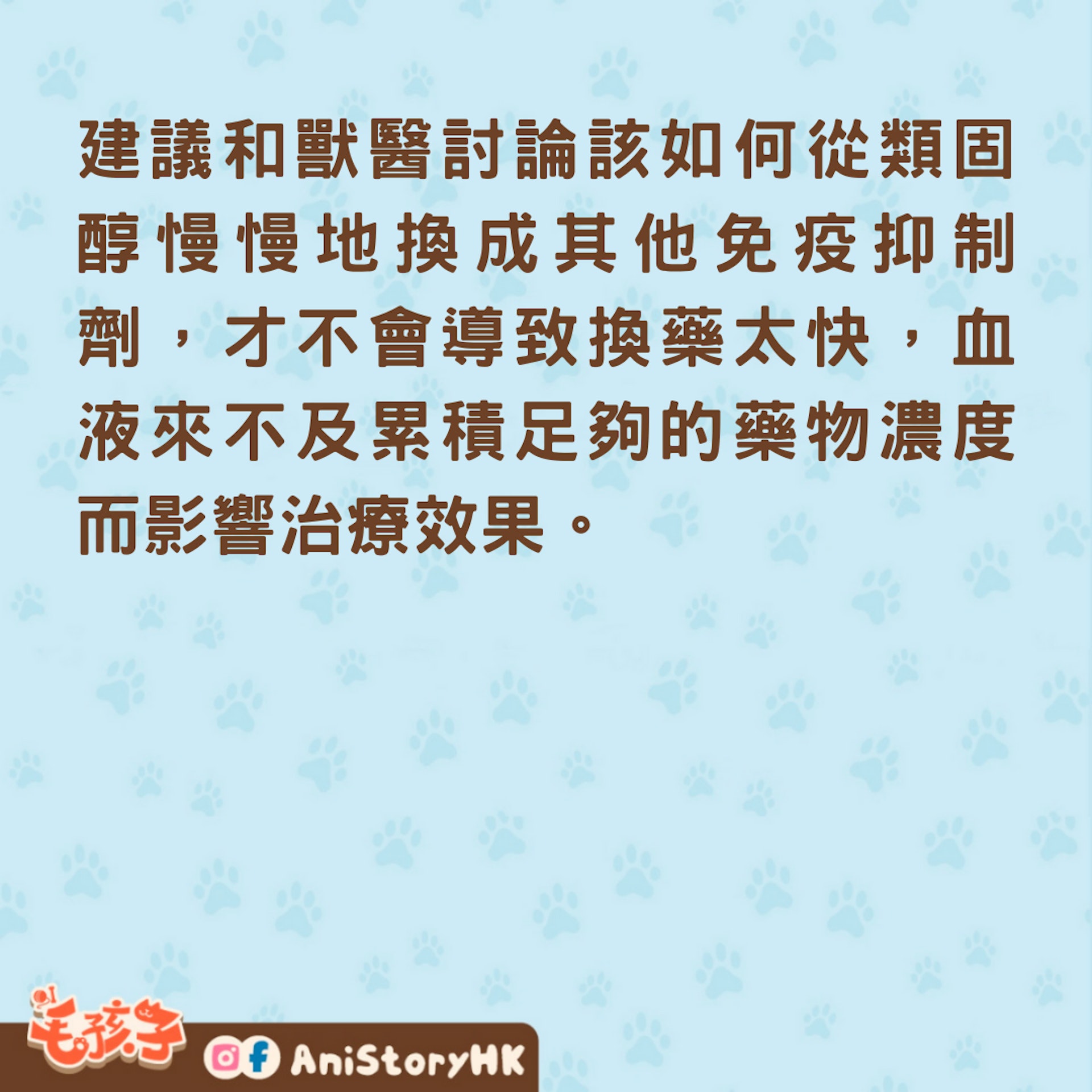 建議和獸醫討論該如何從類固醇慢慢地換成其他免疫抑制劑,才不會導致換藥太快,血液來不及累積足夠的藥物濃度而影響治療效果。