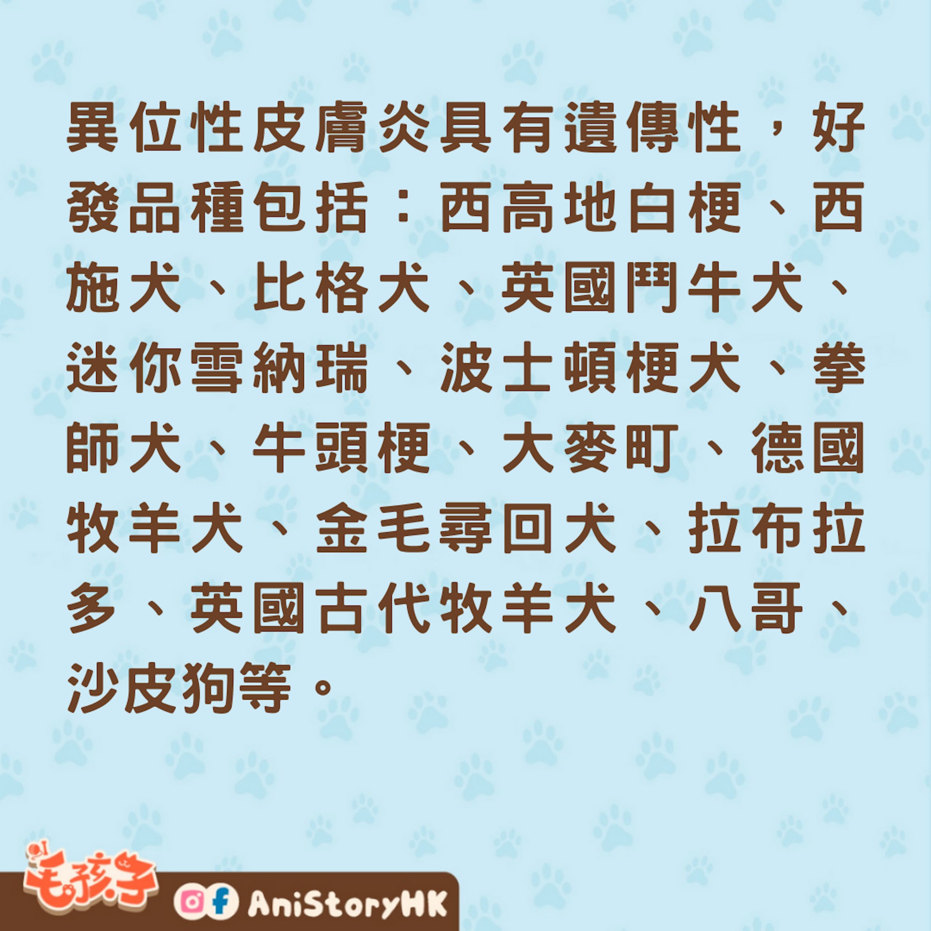 異位性皮膚炎具有遺傳性,好發品種包括:西高地白梗、西施犬、比格犬、英國鬥牛犬、迷你雪納瑞、波士頓梗犬、拳師犬、牛頭梗、大麥町、德國牧羊犬、金毛尋回犬、拉布拉多、英國古代牧羊犬、八哥、沙皮狗等。