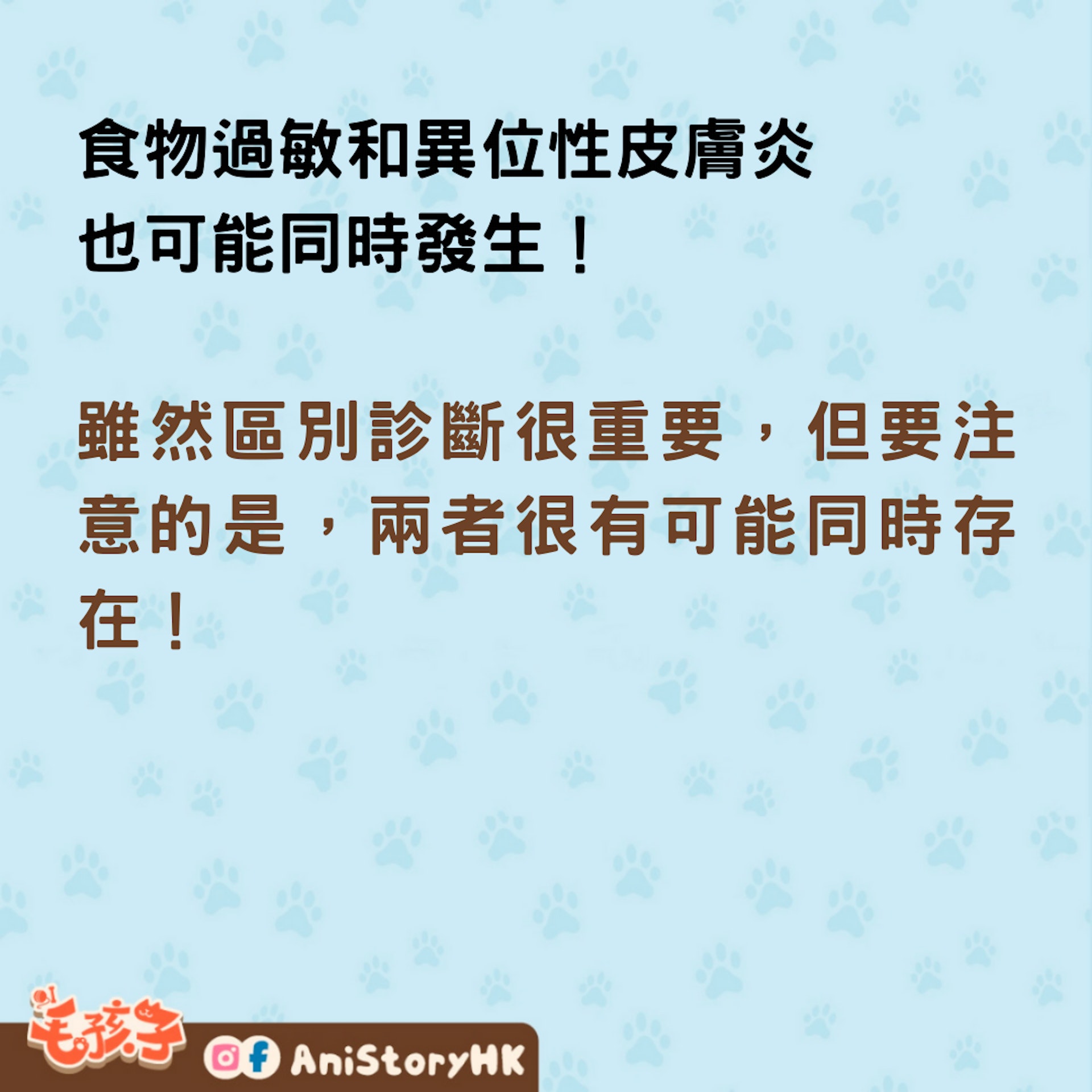 雖然區別診斷很重要,但要注意的是,兩者很有可能同時存在!根據研究統計,有異位性皮膚炎的動物有高達30%同時有食物過敏,所以好好控制食物過敏的狀況後,異位性皮膚炎的狀況也可能會隨之改善。
