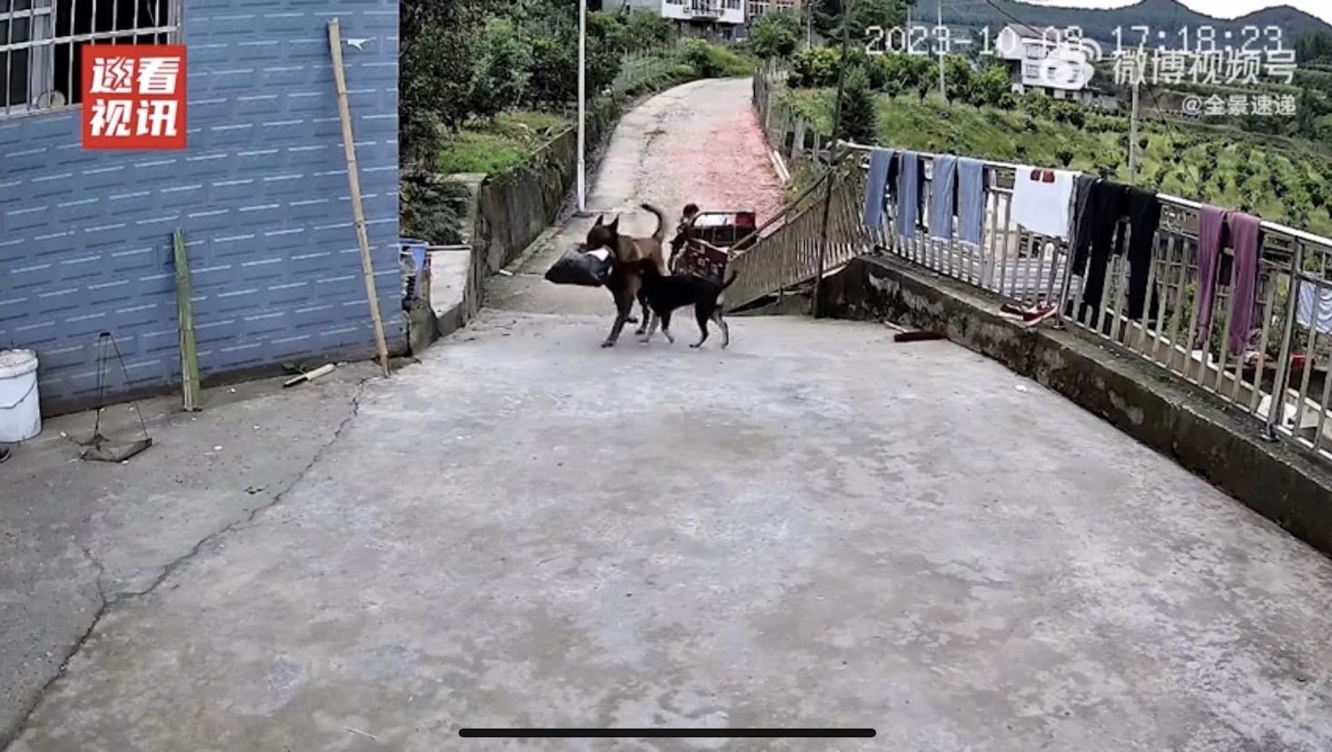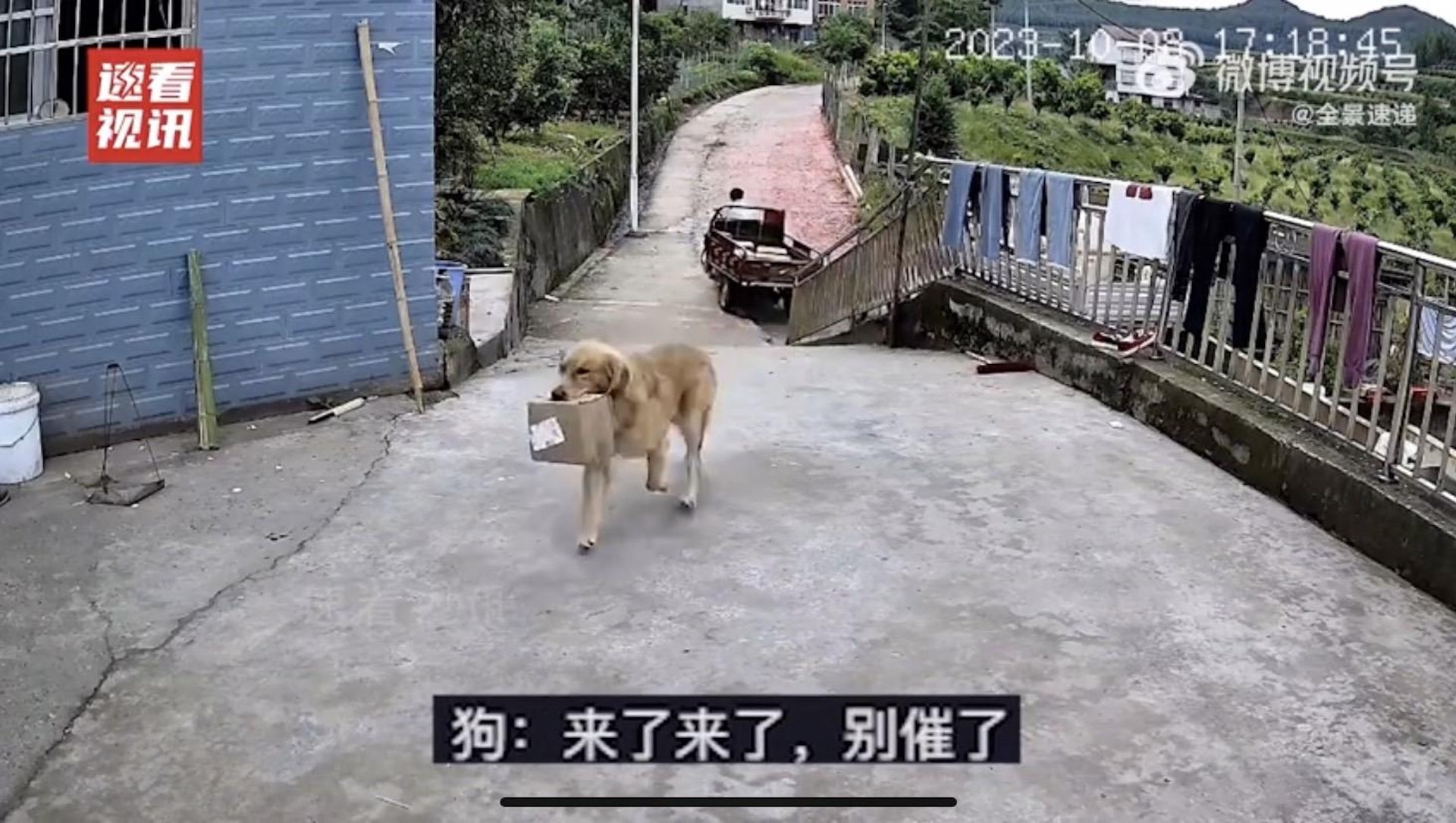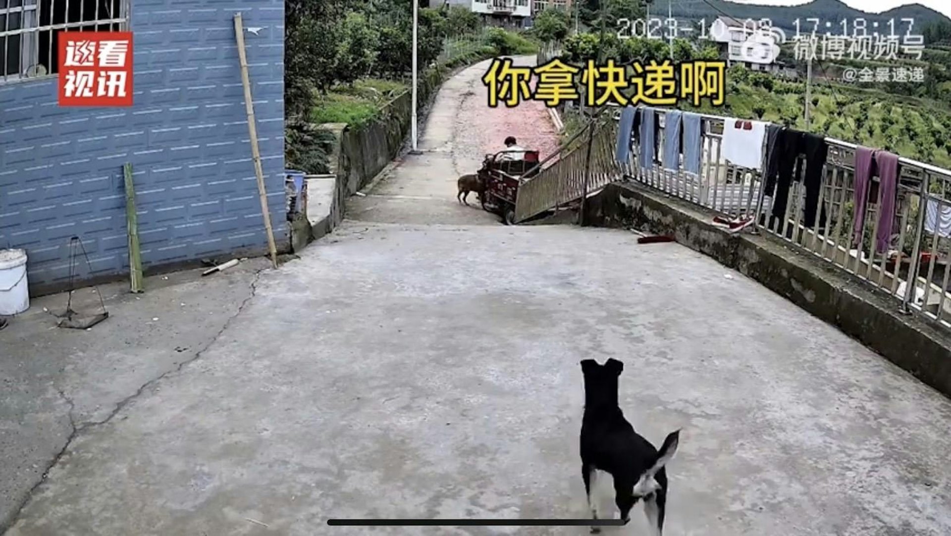 四川一則快遞簽收的影片引發網民關注。明明主人不在家,快遞卻顯示「兩條狗簽收」,回家看監控重播把人笑的肚子疼。(翻攝微博)
