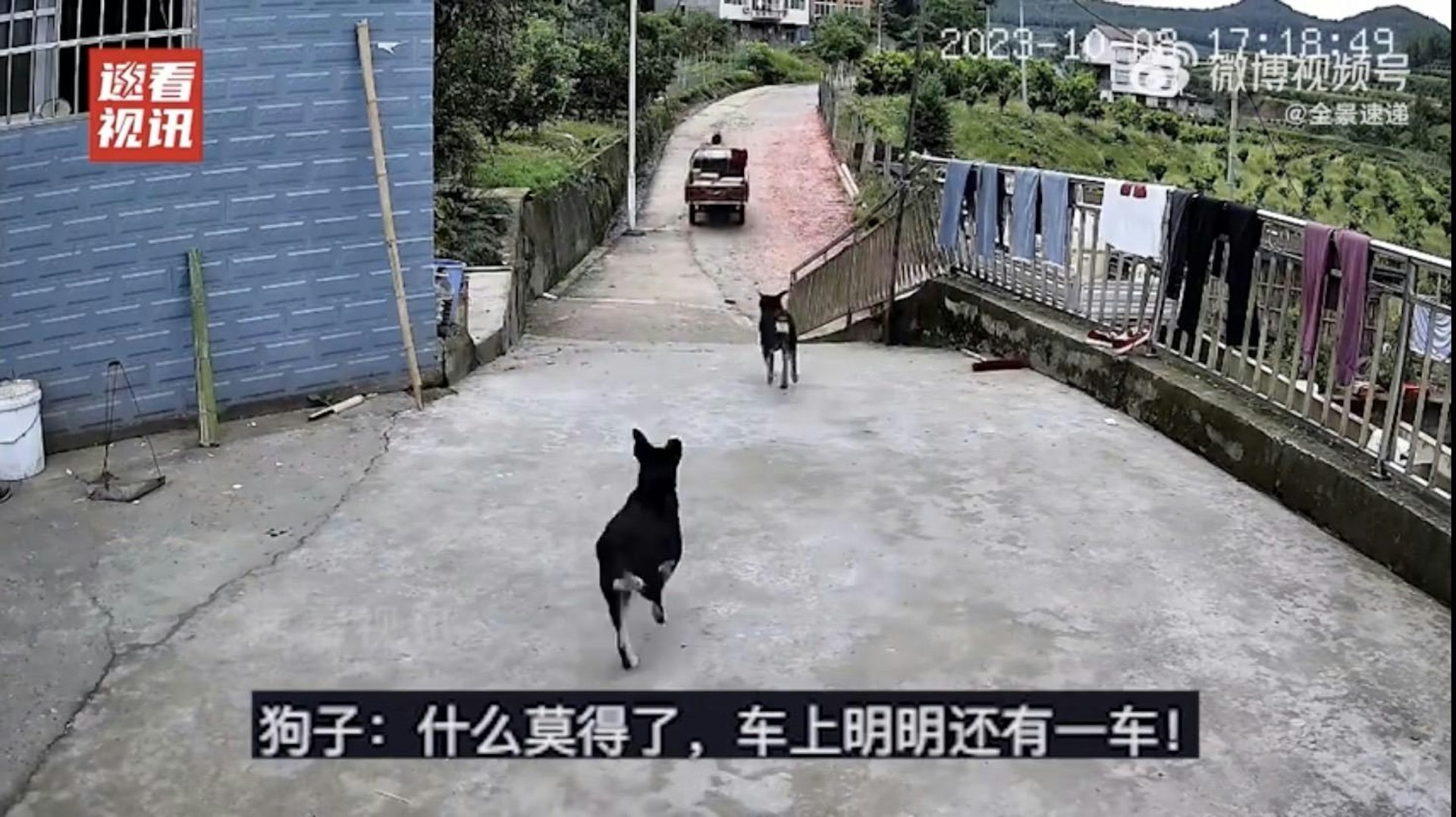 最後看兩隻黑狗追著快遞員遠去,網民見了影片都覺得溫馨,笑稱「雞肋婚姻,還不如養只狗」、「比人還精」、「有沒有可能牠們就是本人?」