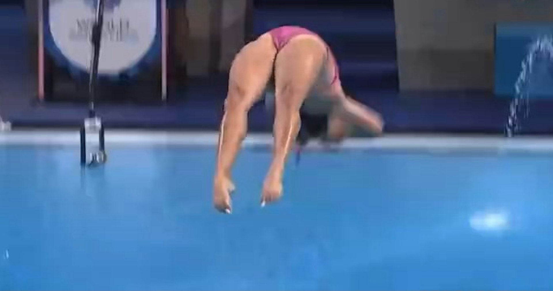+ C) v% t* r) O4 A8 G墨西哥選手華斯姬絲(Aranza Vazquez)在第四跳犯下嚴重錯誤,炸出巨型水花,全部裁判給她0分。(網上片段截圖)