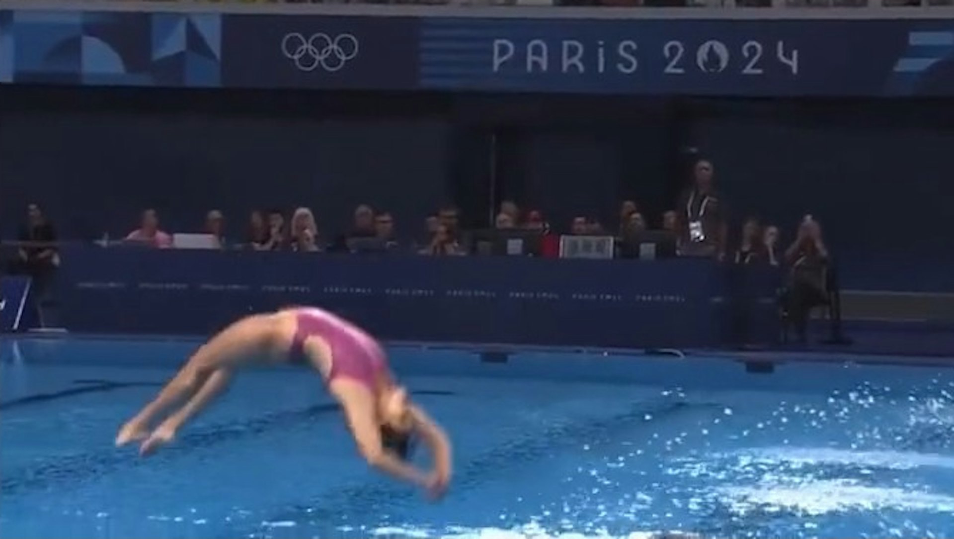 墨西哥選手華斯姬絲(Aranza Vazquez)在第四跳犯下嚴重錯誤,炸出巨型水花,全部裁判給她0分。(網上片段截圖)" k4 l+ W+ J% Q- v